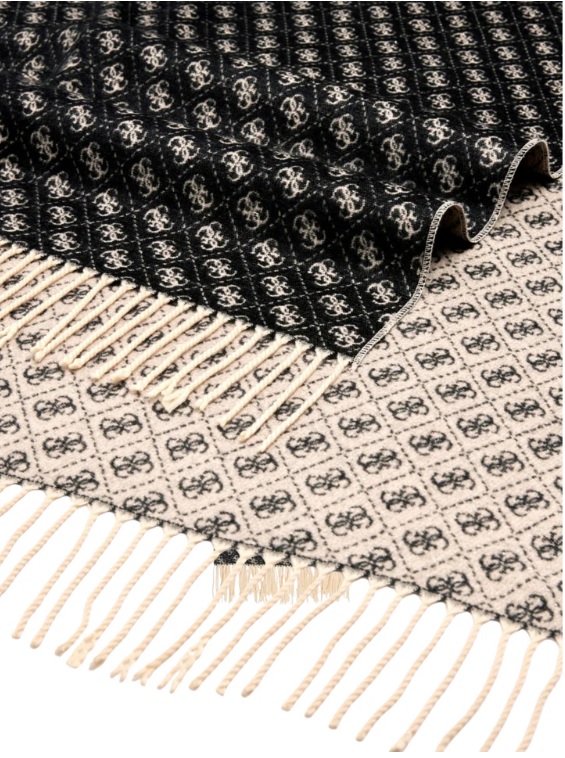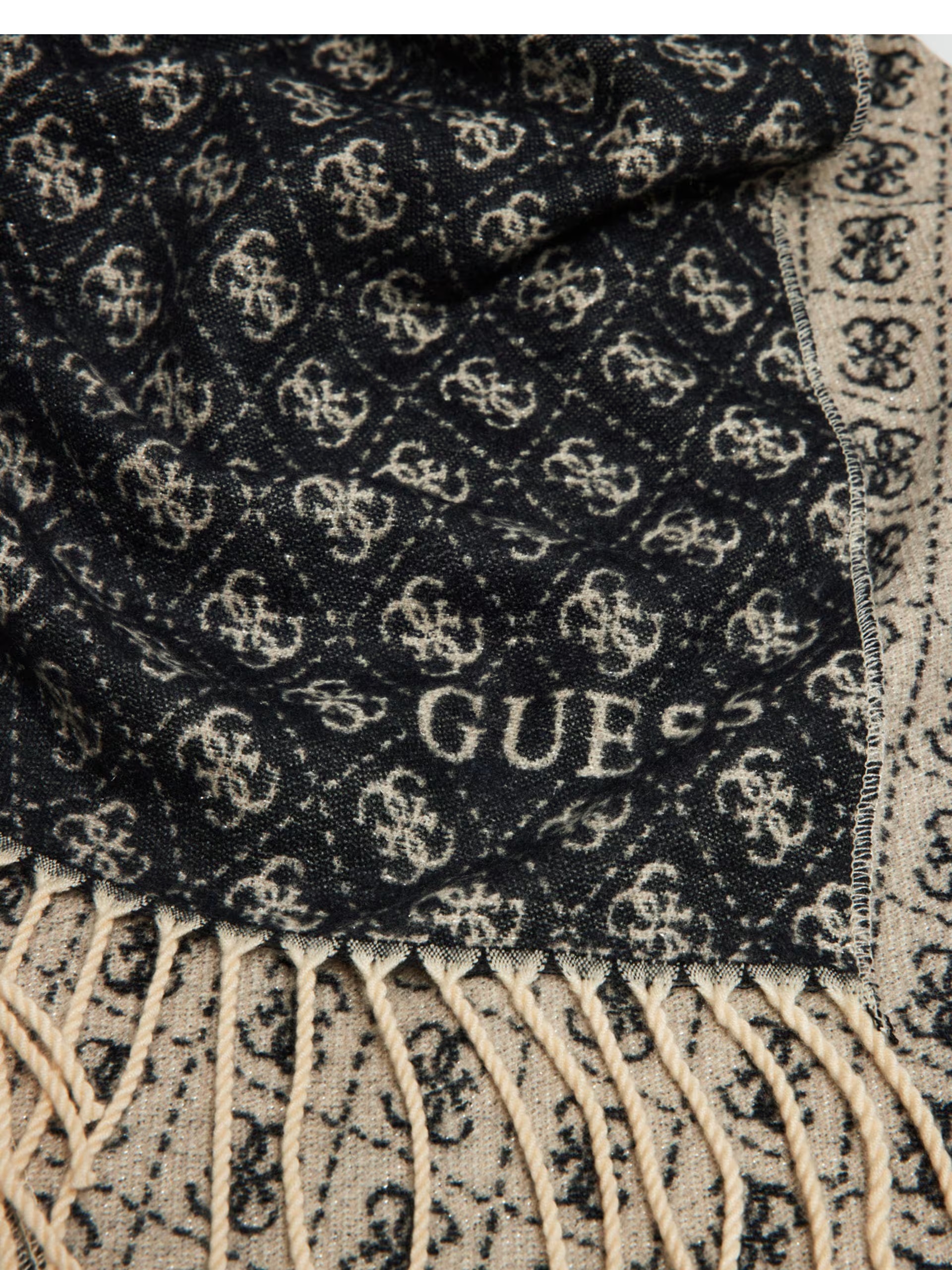 Sciarpa da donna Guess in morbido tessuto con stampa monogram beige su base nera. Design elegante e raffinato, arricchito da frange decorative e logo Guess ricamato sullestremità. Le dimensioni generose (60x180 cm) la rendono perfetta da avvolgere o drappeggiare per completare i look invernali con stile.
