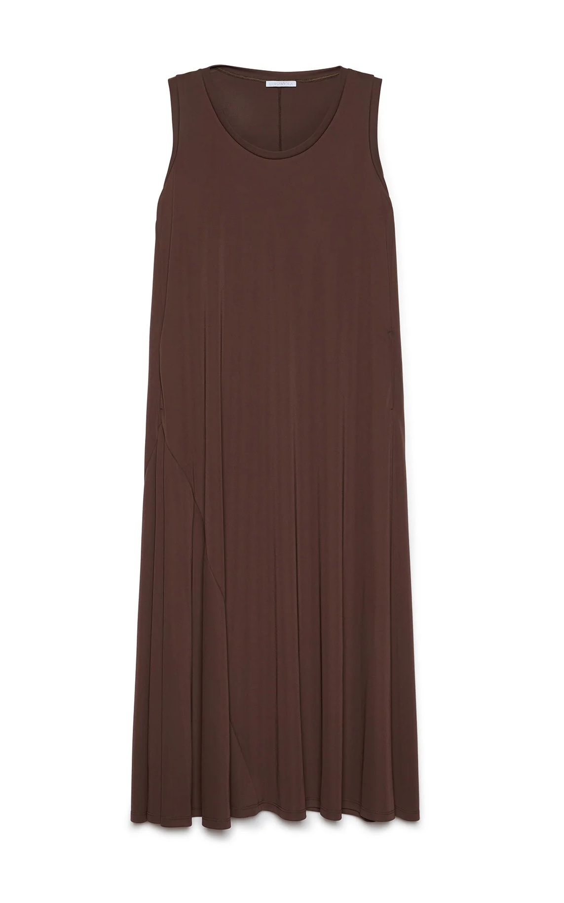 Abito lungo smanicato a trapezio svasato con scollo rotondo e spalline larghe. Lungo fino alla caviglia. La lunghezza totale dalla spalla al fondo è di circa 130-135 cm. Appartiene alla linea "Lava, Stendi e Indossa". Vestibilità comoda.