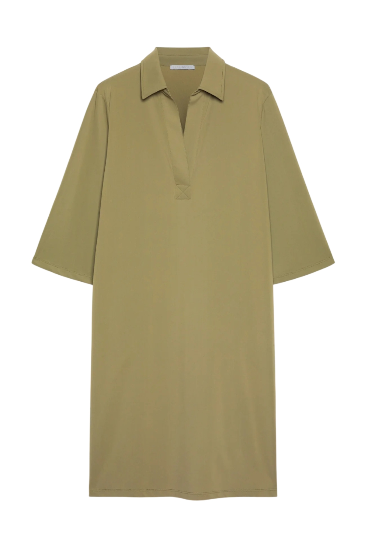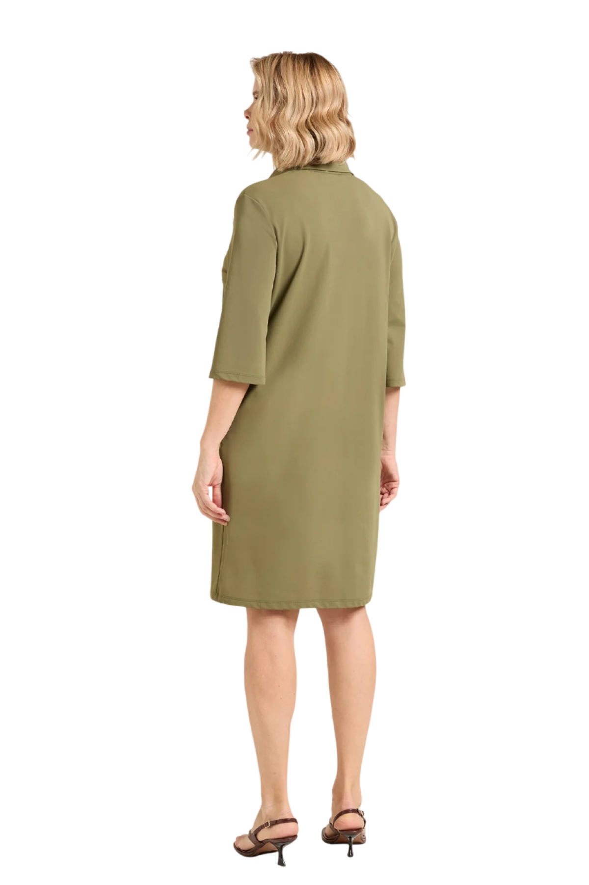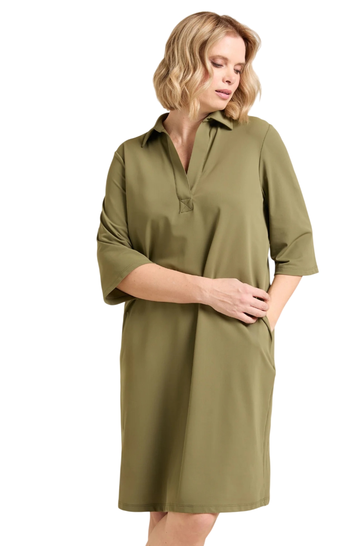 Abito polo in jersey con armatura piquet dalla linea comoda. Tessuto elasticizzato. Colletto polo, manica con lunghezza a tre quarti, tasche a scomparsa. Lavaggio a mano delicato.