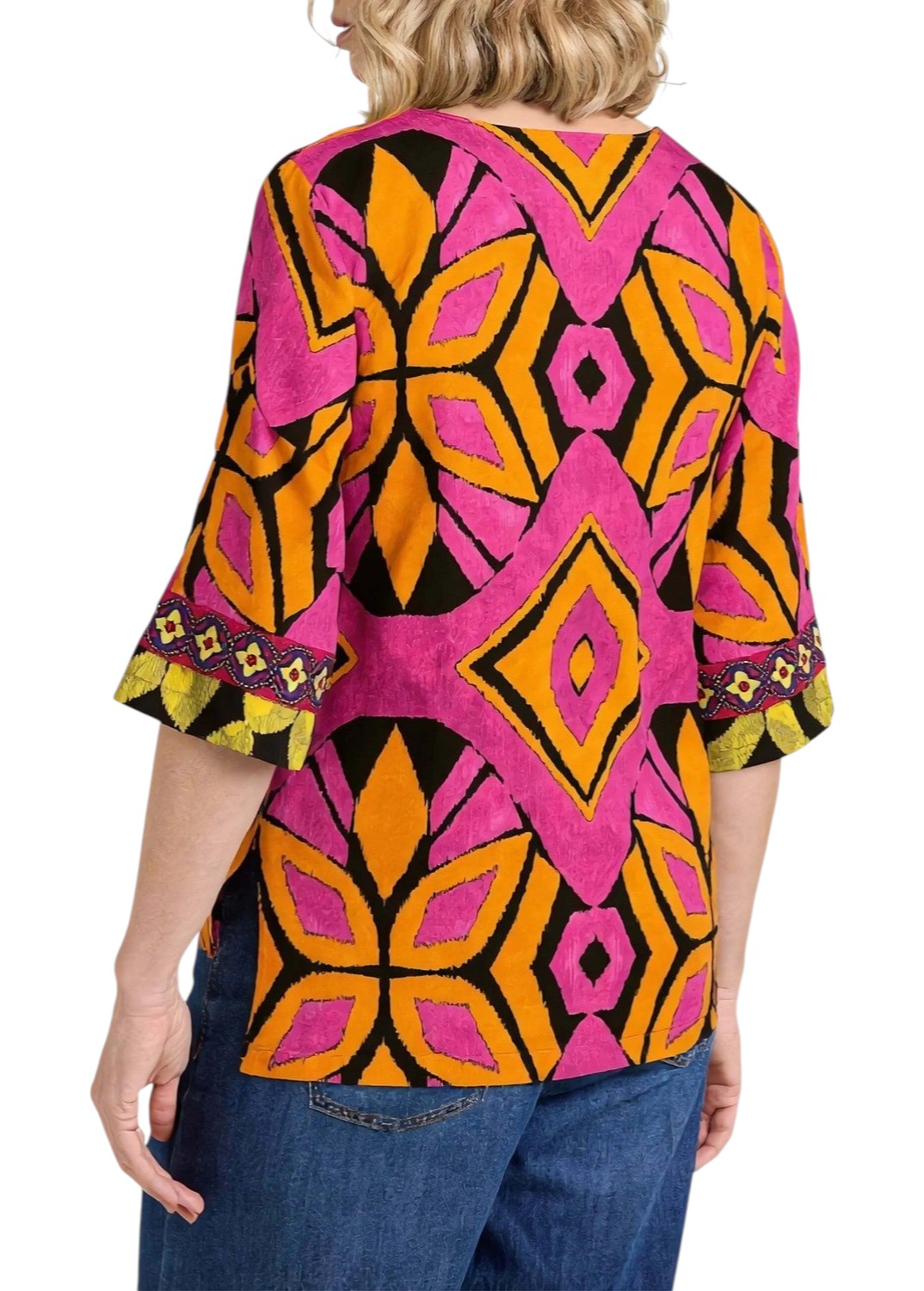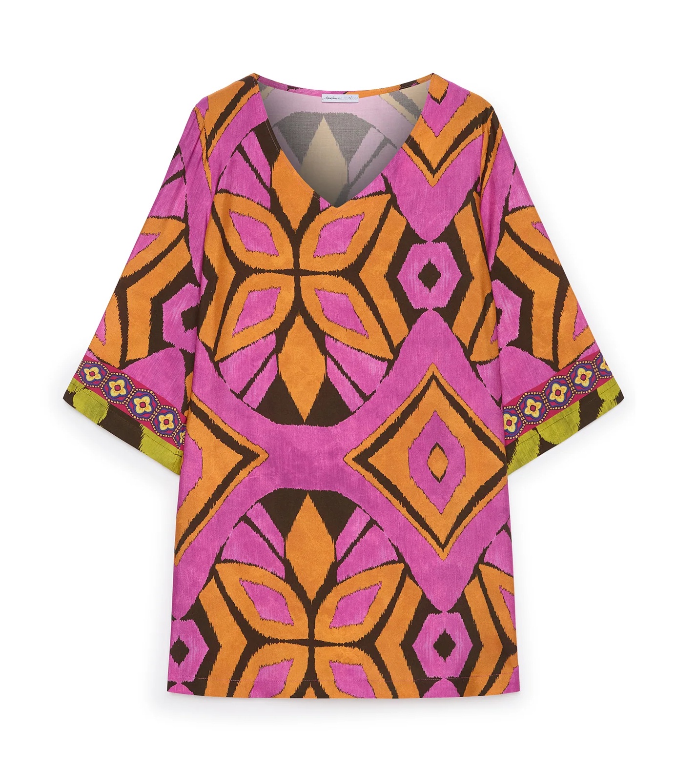 Blusa giavanese dalla linea dritta con un taglio a kimono con scollo a V e maniche ampie a tre quarti. I bordi delle maniche presentano una bordura a contrasto con piccoli motivi geometrici. Vestibilità over.