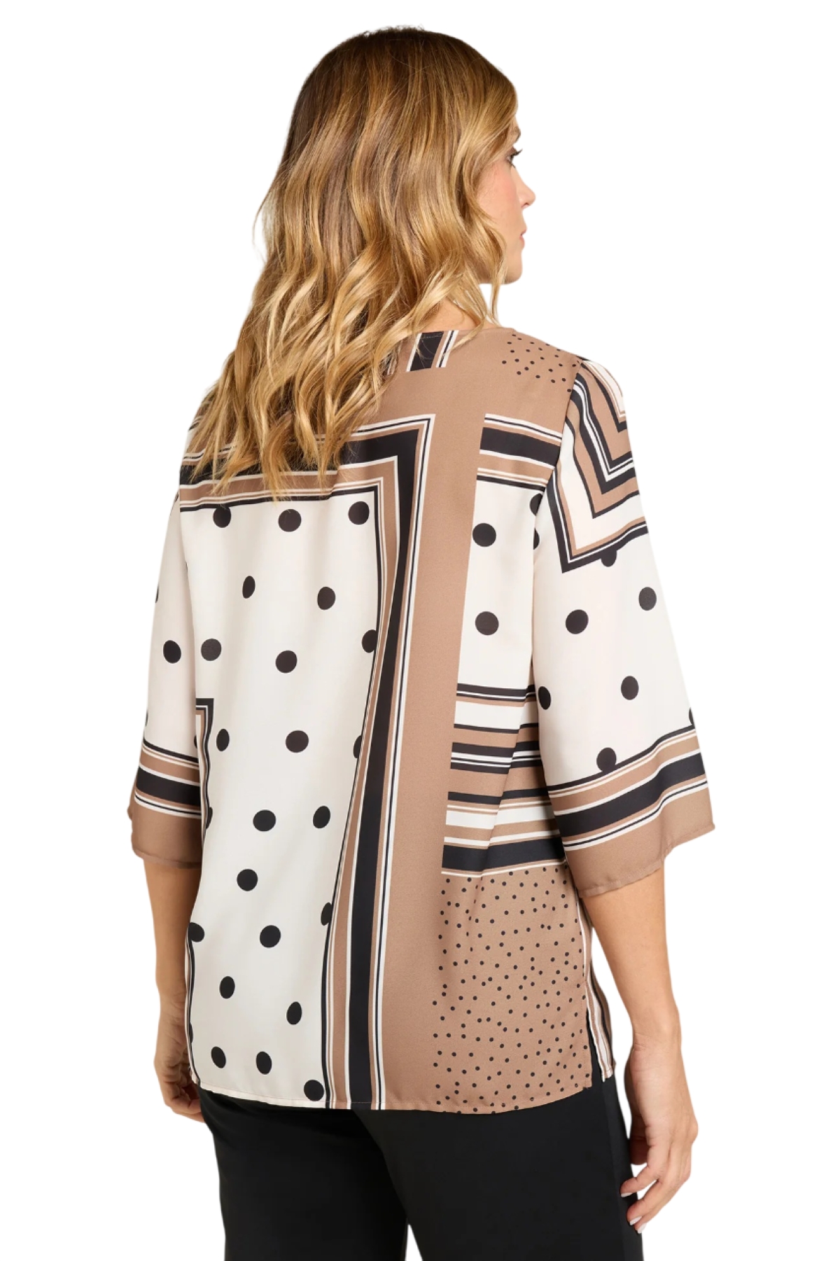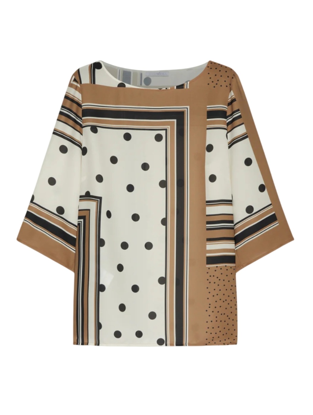 Blusa fantasia stampa patchwork pois in doppia georgette stampata dalla linea dritta con spacchi laterali. Scollo a barchetta, Maniche con lunghezza a tre quarti. realizzata in un tessuto easy care dalla facile manutenzione: il capo si lava, si stende e si indossa senza la necessità di dover essere stirato.