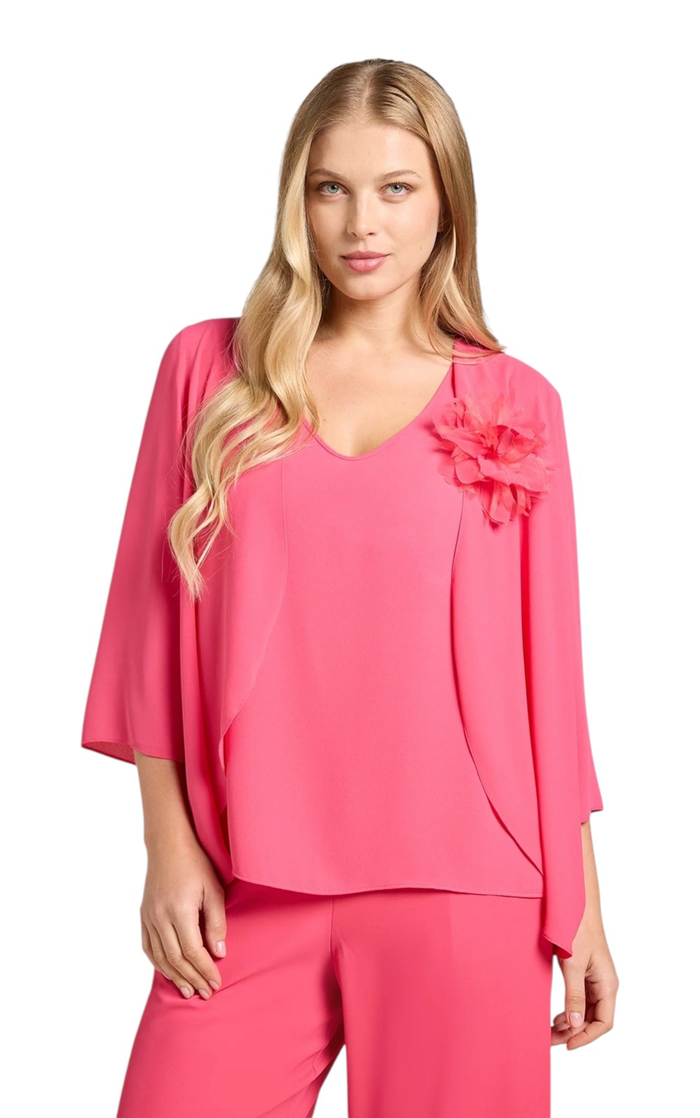Twin-set composto da due pezzi sovrapposti: un top interno e uno spolverino. Maniche ampie a tre quarti e un taglio asimmetrico. Applicazione di un fiore in tessuto tridimensionale posto sulla spalla. Vestibilità Curvy.