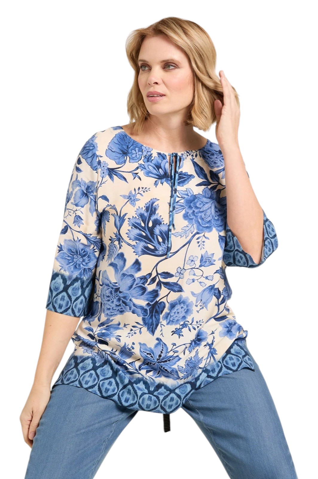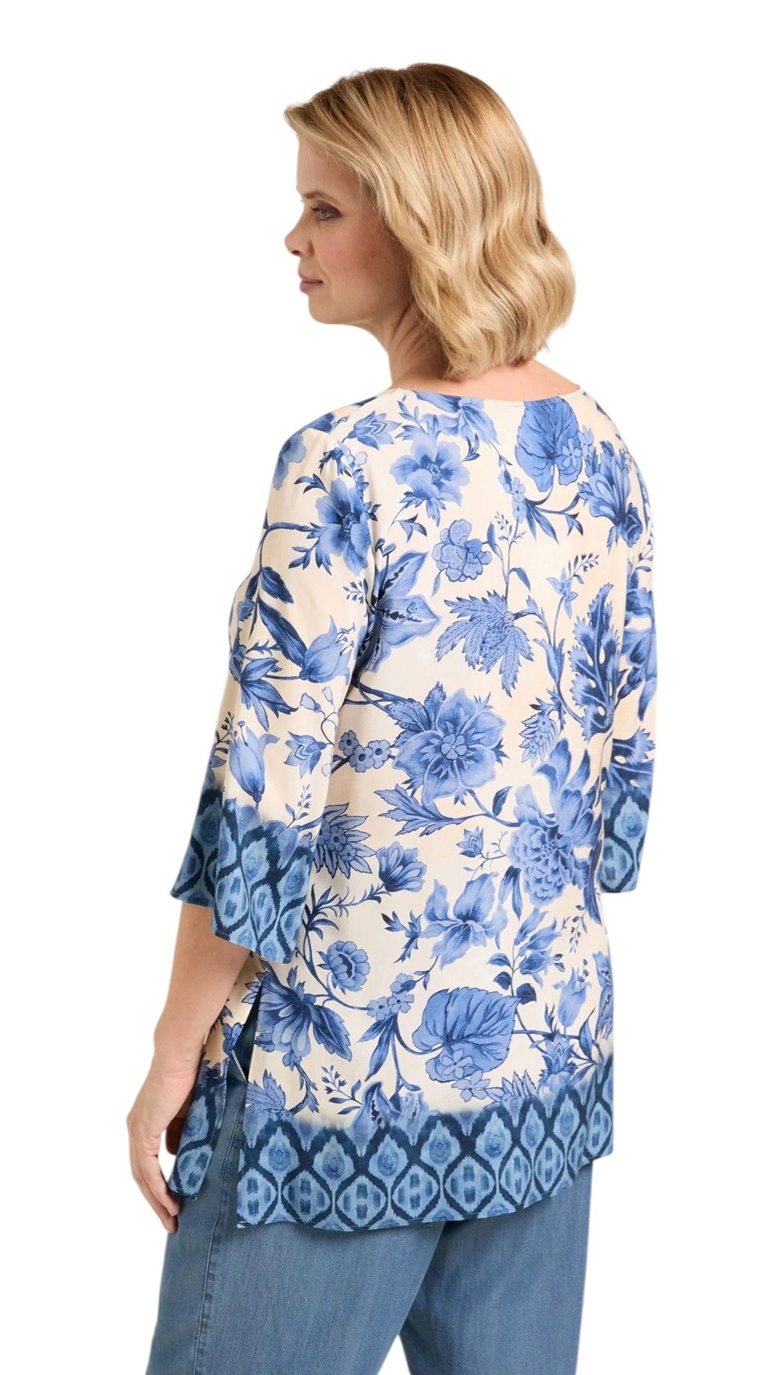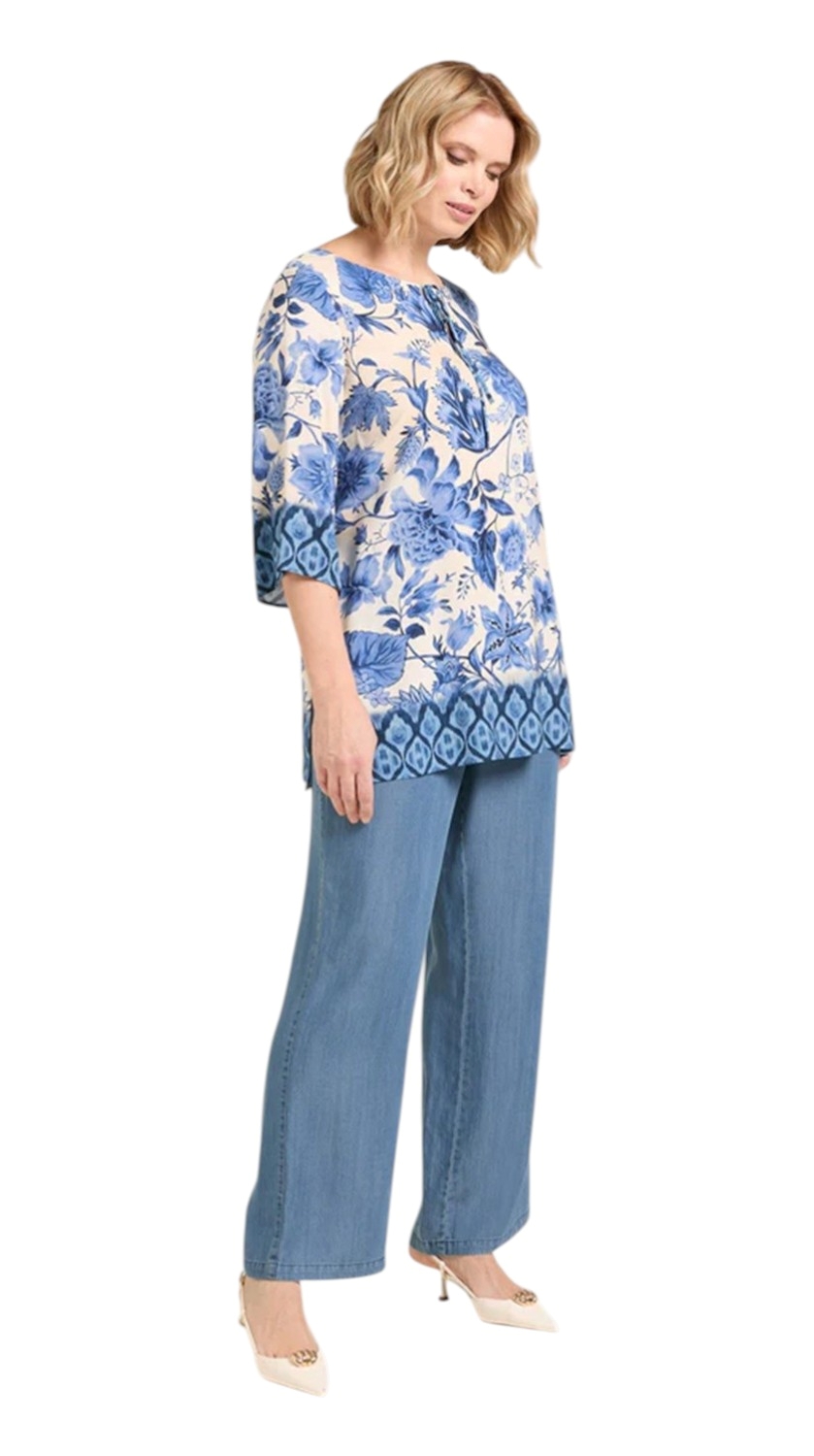 Caftano corto con scollo a V e maniche ampie a tre quarti. Taglio dritto e scivolato tipico di una blusa. Presenta piccoli spacchi laterali al fondo. Questo modello è pensato per essere portato fuori dai pantaloni. Vestibilità over.