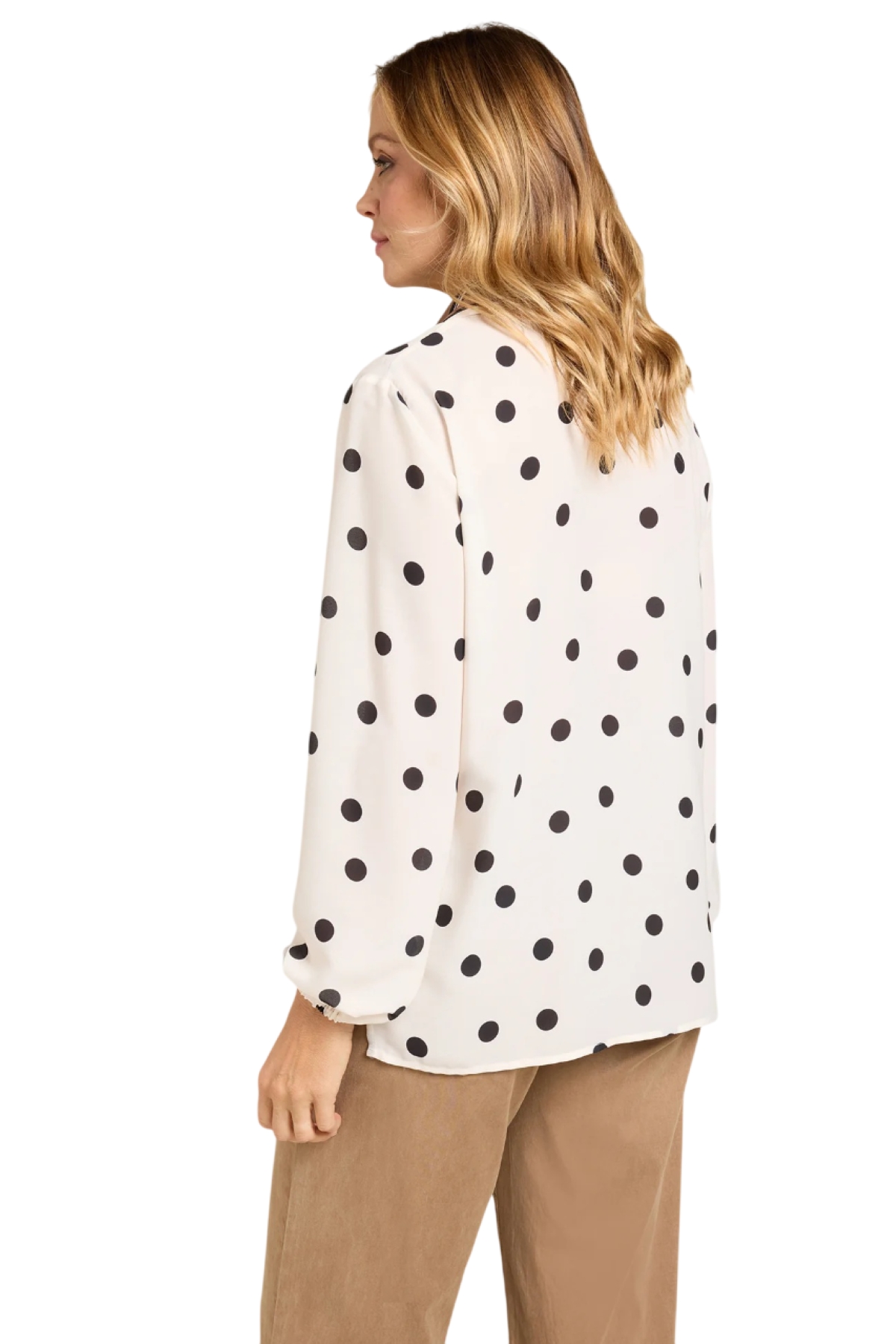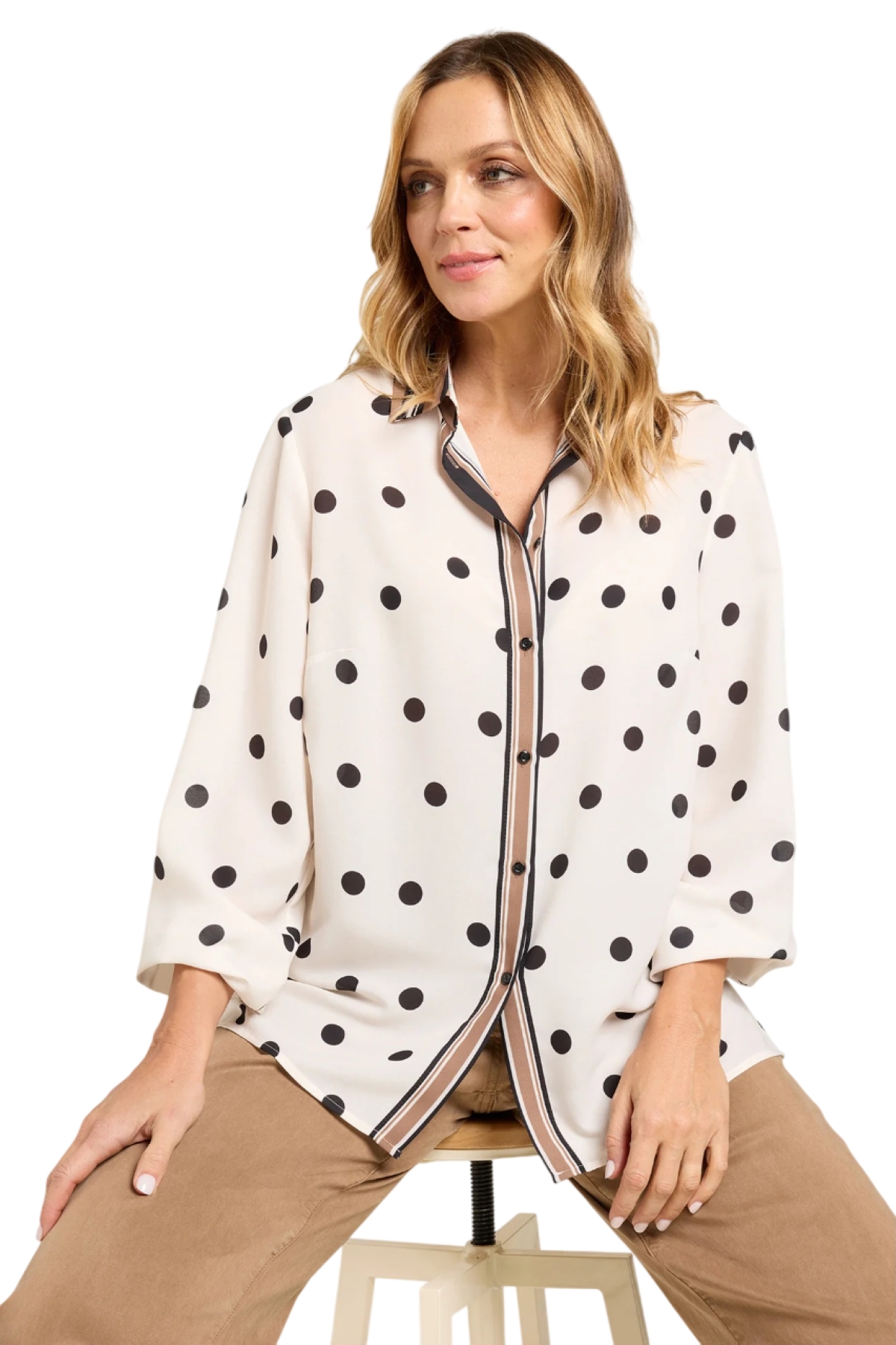 Camicia fantasia a pois con bordi rigati in doppia georgette stampata dalla linea dritta con spacchi laterali. Colletto e listino, chiusura con bottoni, maniche lunghe a sbuffo. Realizzata in un tessuto easy care. Il capo si lava, si stende e si indossa senza la necessità di dover essere stirato.