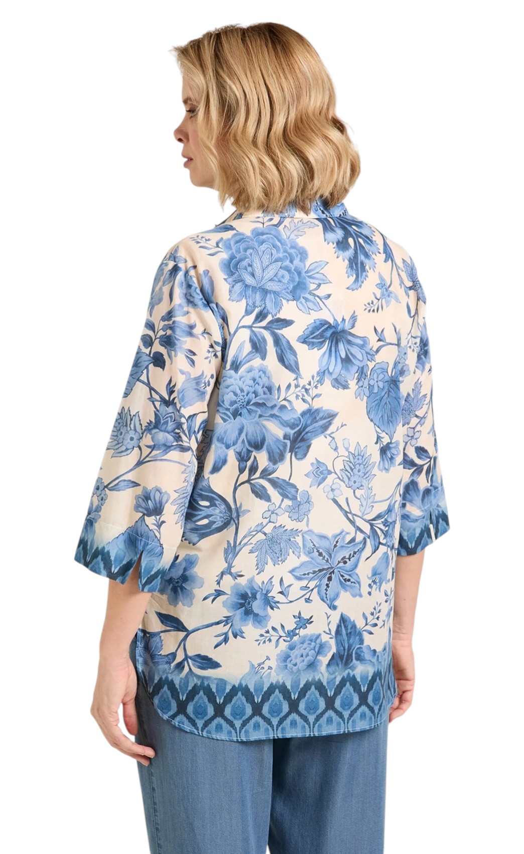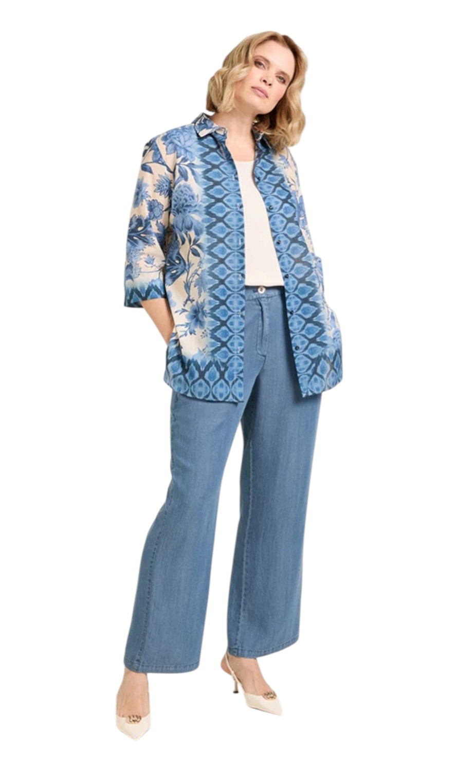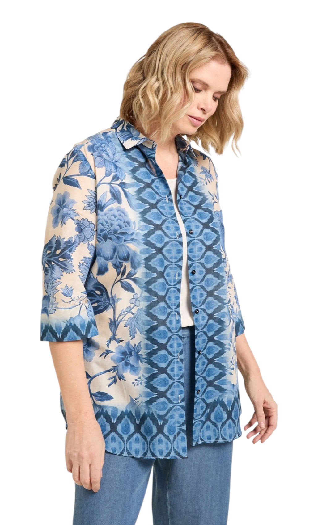 Camicia stampata caratterizzata da una chiusura frontale completa con bottoni scuri a contrasto e un colletto classico a vela. Maniche a tre quarti. Il capo presenta una fantasia patchwork con motivi floreali macro, peonie e rose e decori geometrici. Vestibilità curvy.