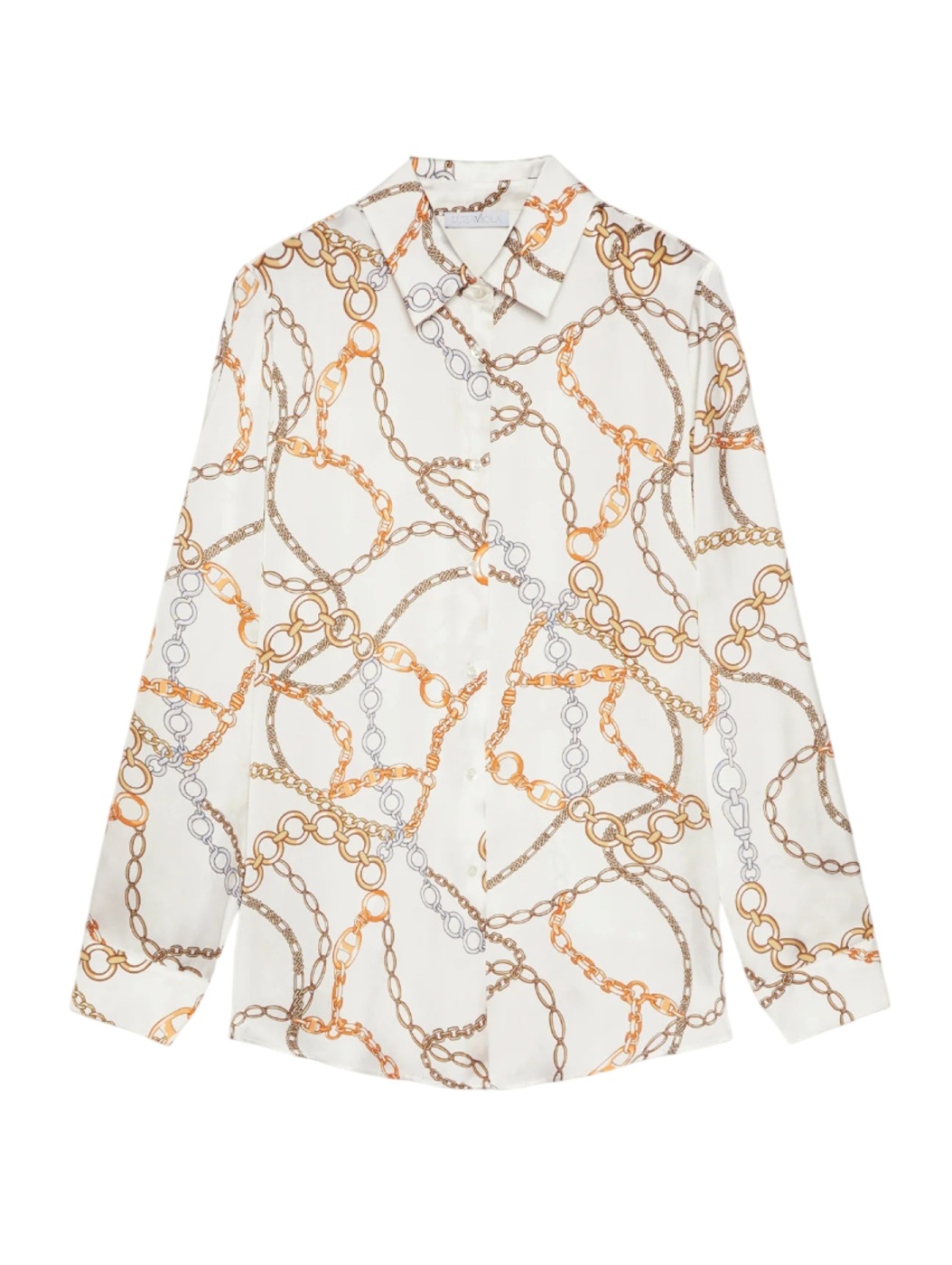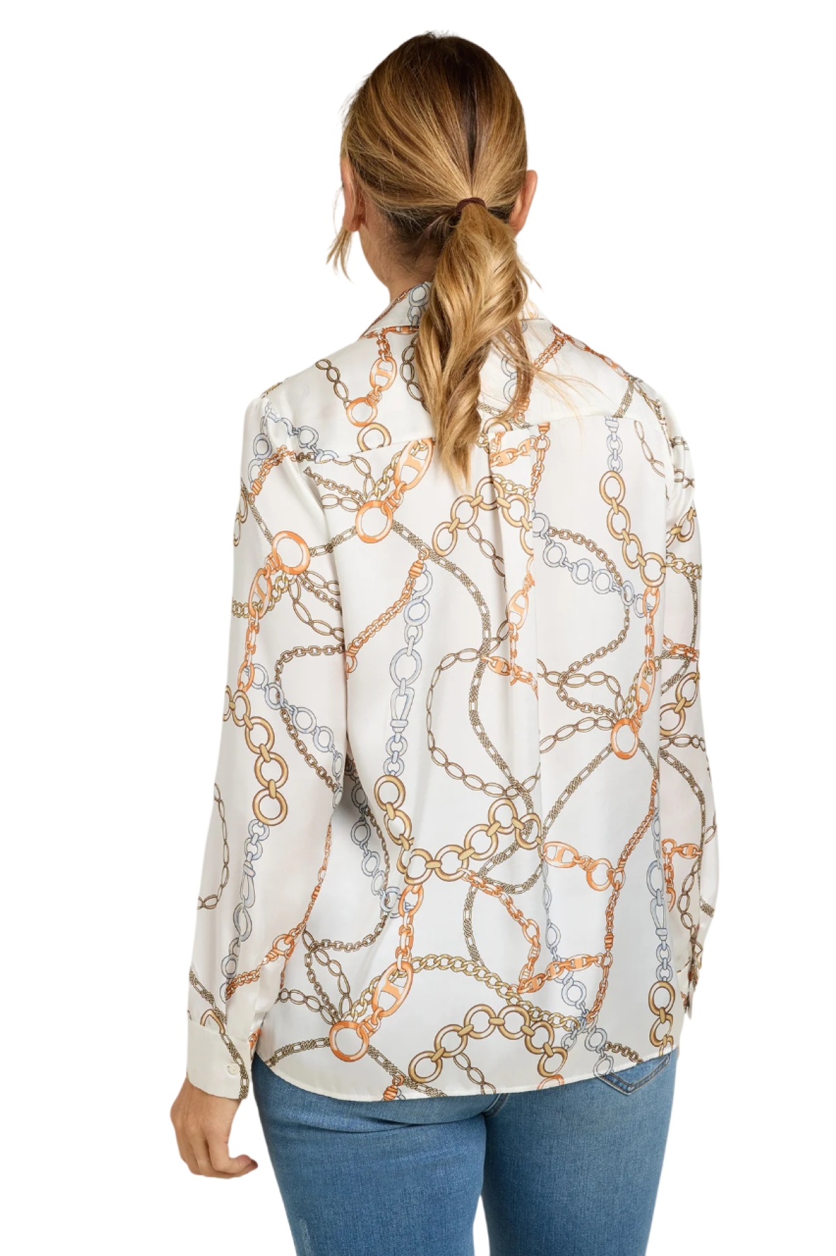 Camicia fantasia in satin stampato dalla linea dritta con spacchi laterali. Colletto e listino, chiusura con asole e bottoni, manica lunga con polso. Dietro con carrè doppio e soffietto. Il capo si lava, si stende e si indossa senza la necessità di dover essere stirato.
