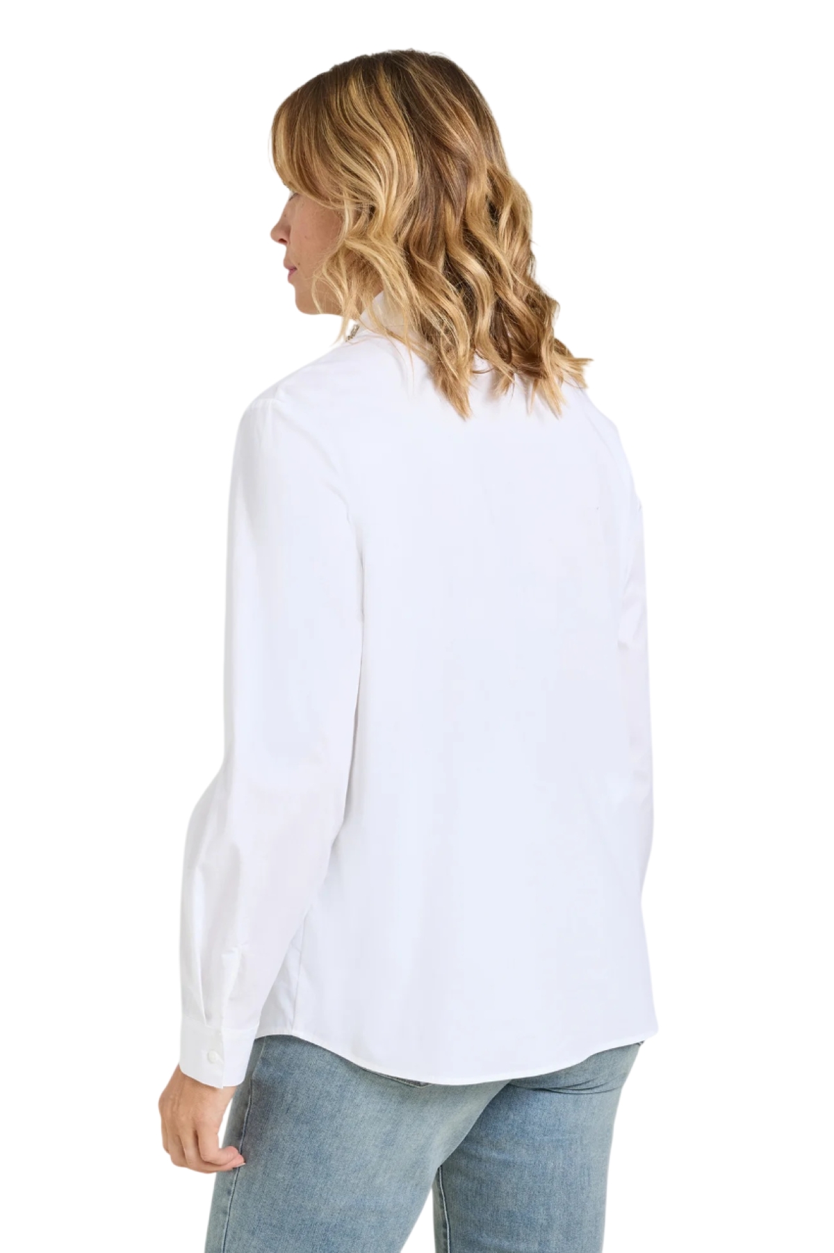 Camicia in popeline di cotone elasticizzato dalla linea dritta, caratterizzata da un collo ricamato a mano con castoni opalescenti, crystal e black. Colletto doppio con listino, chiusura con bottoni, manica lunga con polso, fondo stondato. Il collo ricamato si può facilmente staccare. Lavaggio delicato a mano. Non lavare a secco