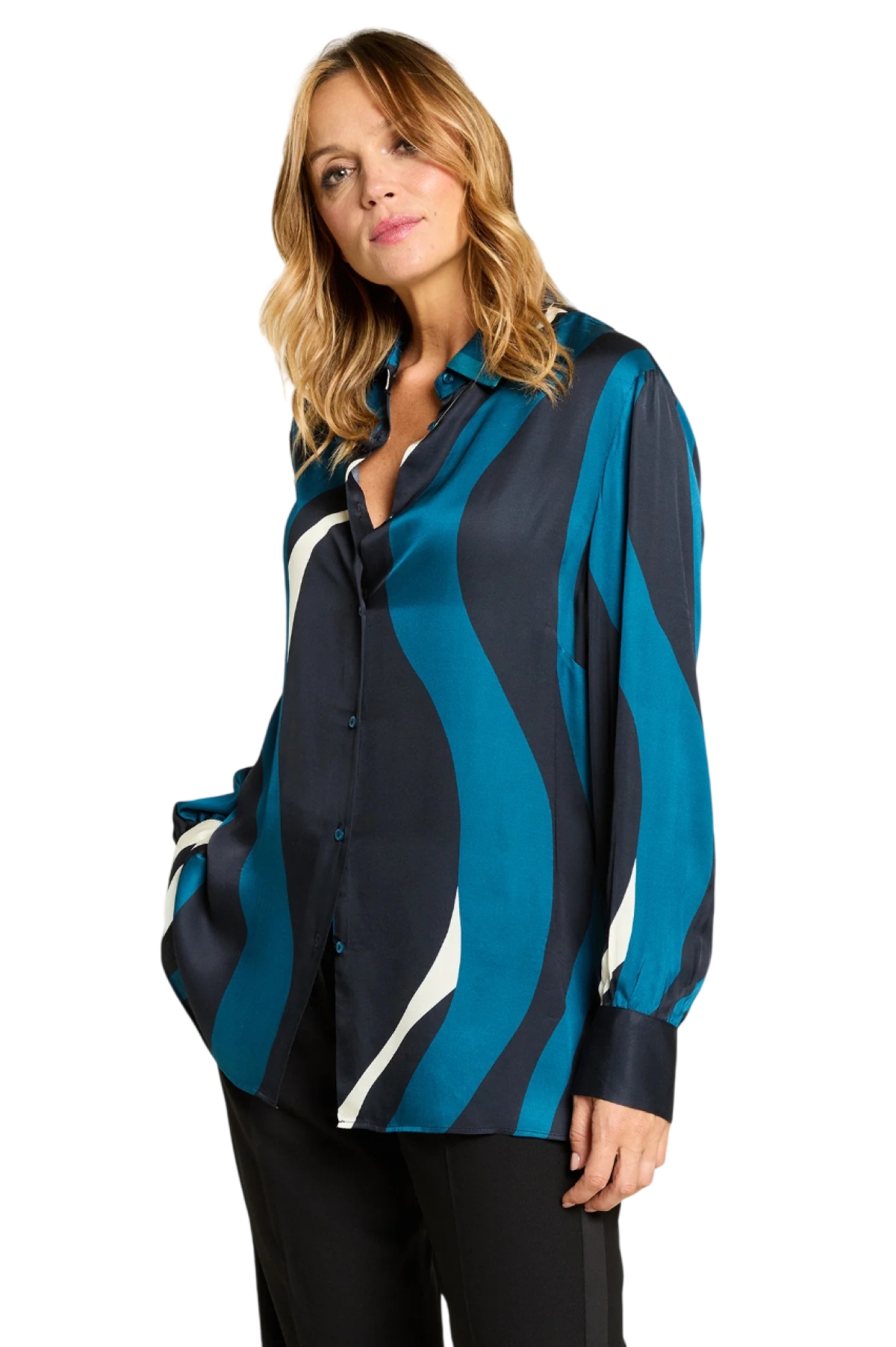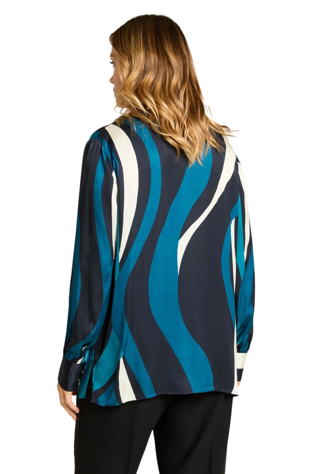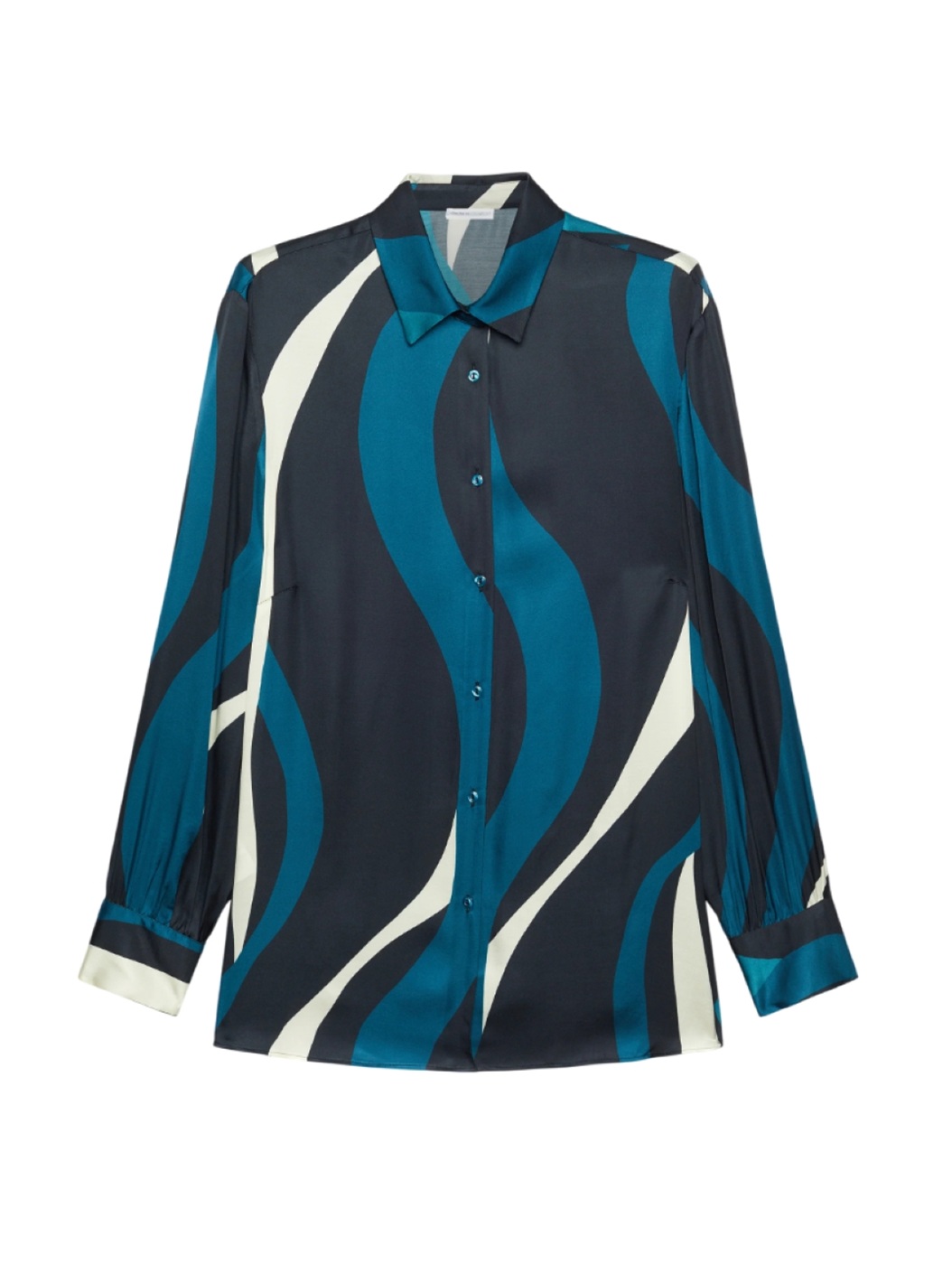 Camicia fantasia psichedelica in satin con linea dritta e spaccchi laterali. Colletto con listino, chiusura con asole e bottoni, manica lunga con polso.