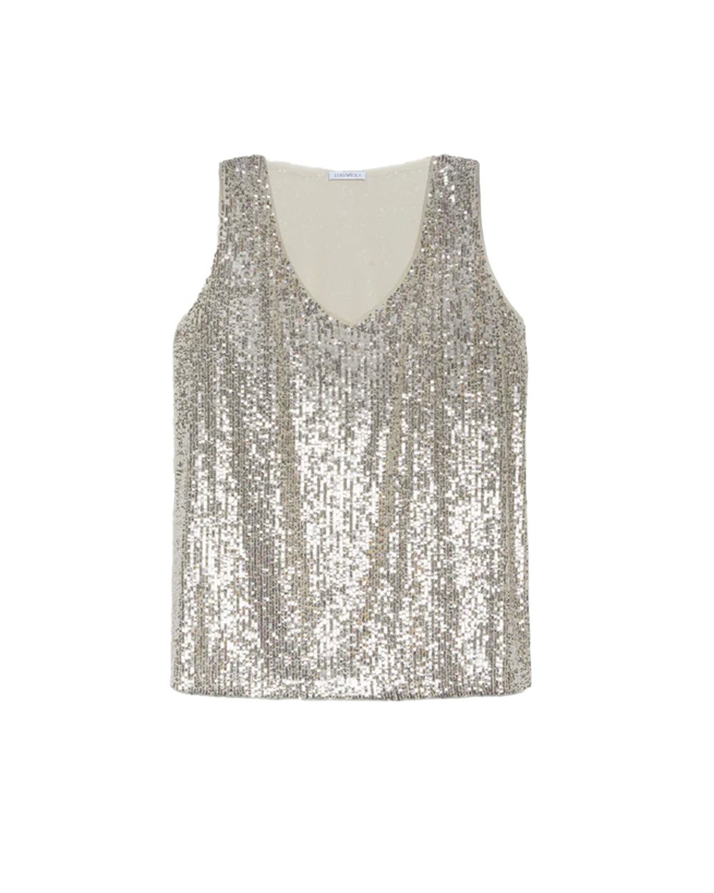 Top protagonista con scollo a v realizzato in tessuto full paillettes elasticizzato, foderato in tulle stretch.
