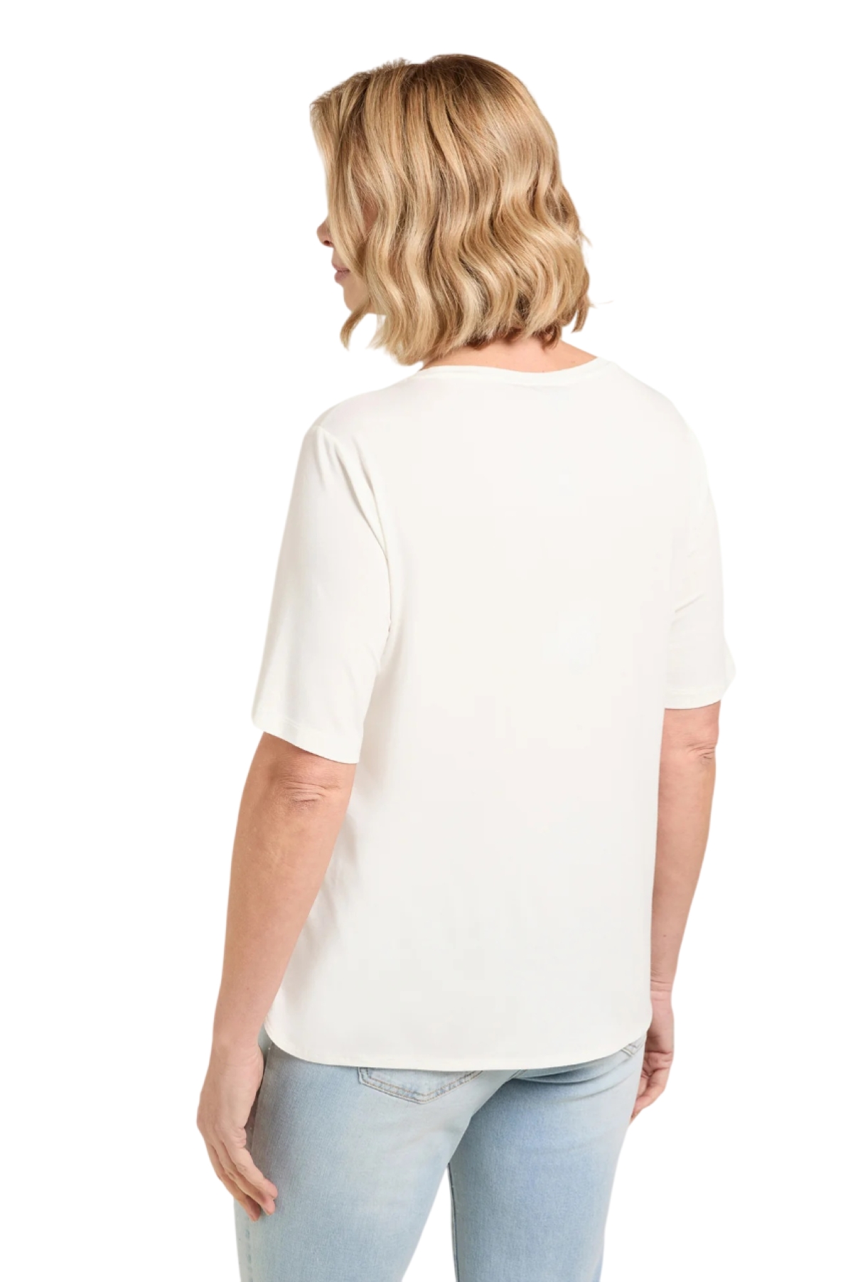 Maglia t-shirt stretch in jersey di viscosa con davanti in raso stampato. Girocollo, manica corta, spacchetti laterali stondate. Lavaggio a mano delicato.