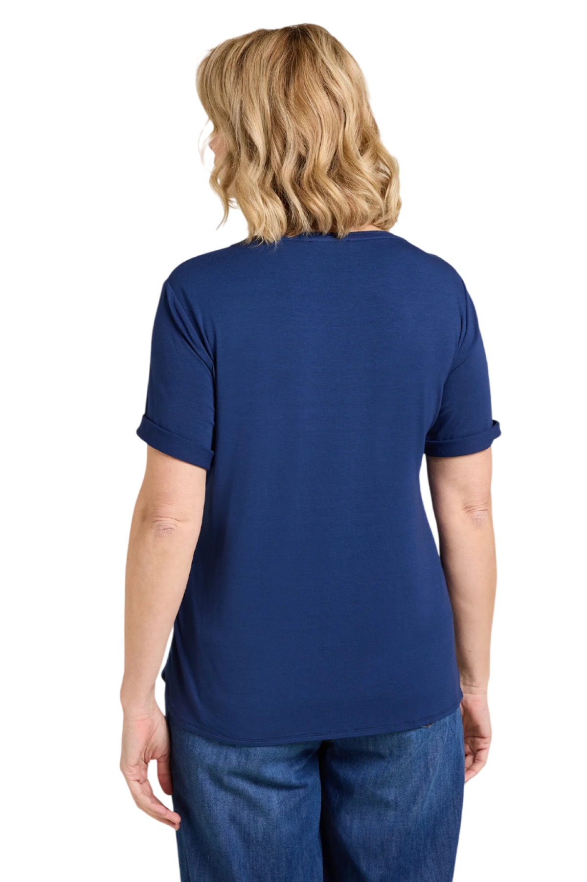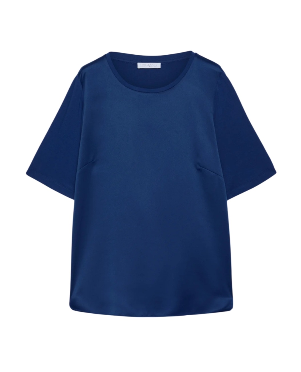 Maglia t-shirt stretch in jersey di viscosa con davanti in raso stampato. Girocollo, manica corta, spacchetti laterali stondate. Lavaggio a mano delicato.