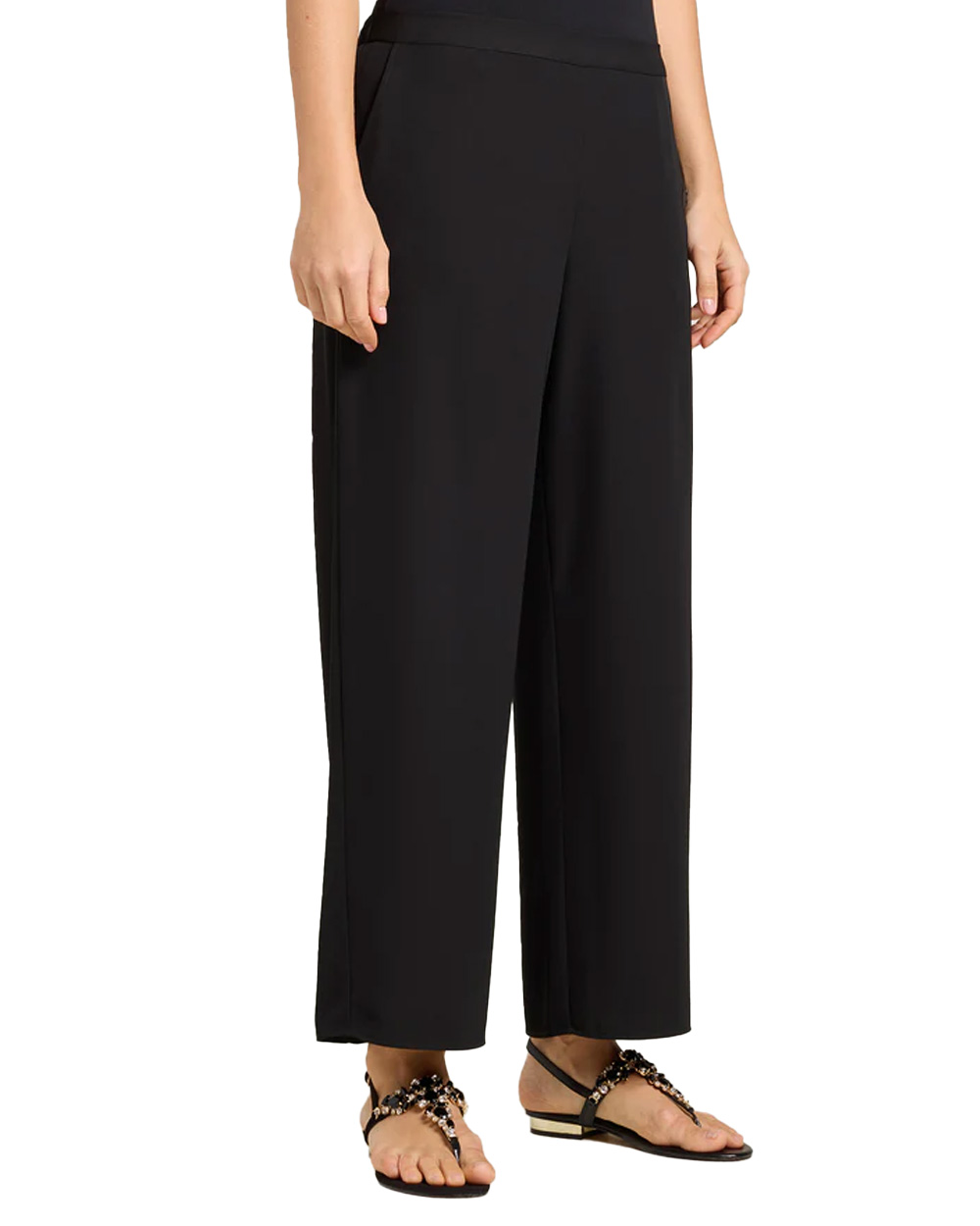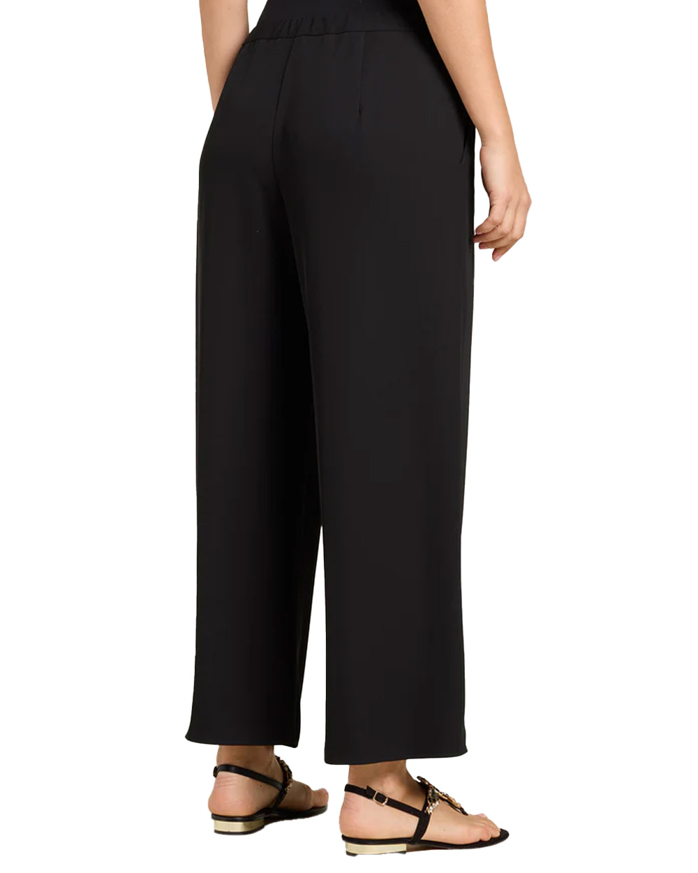 Pantaloni fluidi in cady con fit ampio e lunghezza alla caviglia. Punto vita regolare, cintura estensibile con gros grain elastico inserito nel tratto dietro. Chiusura laterale con bottone e zip invisibile, tasche all'americana.