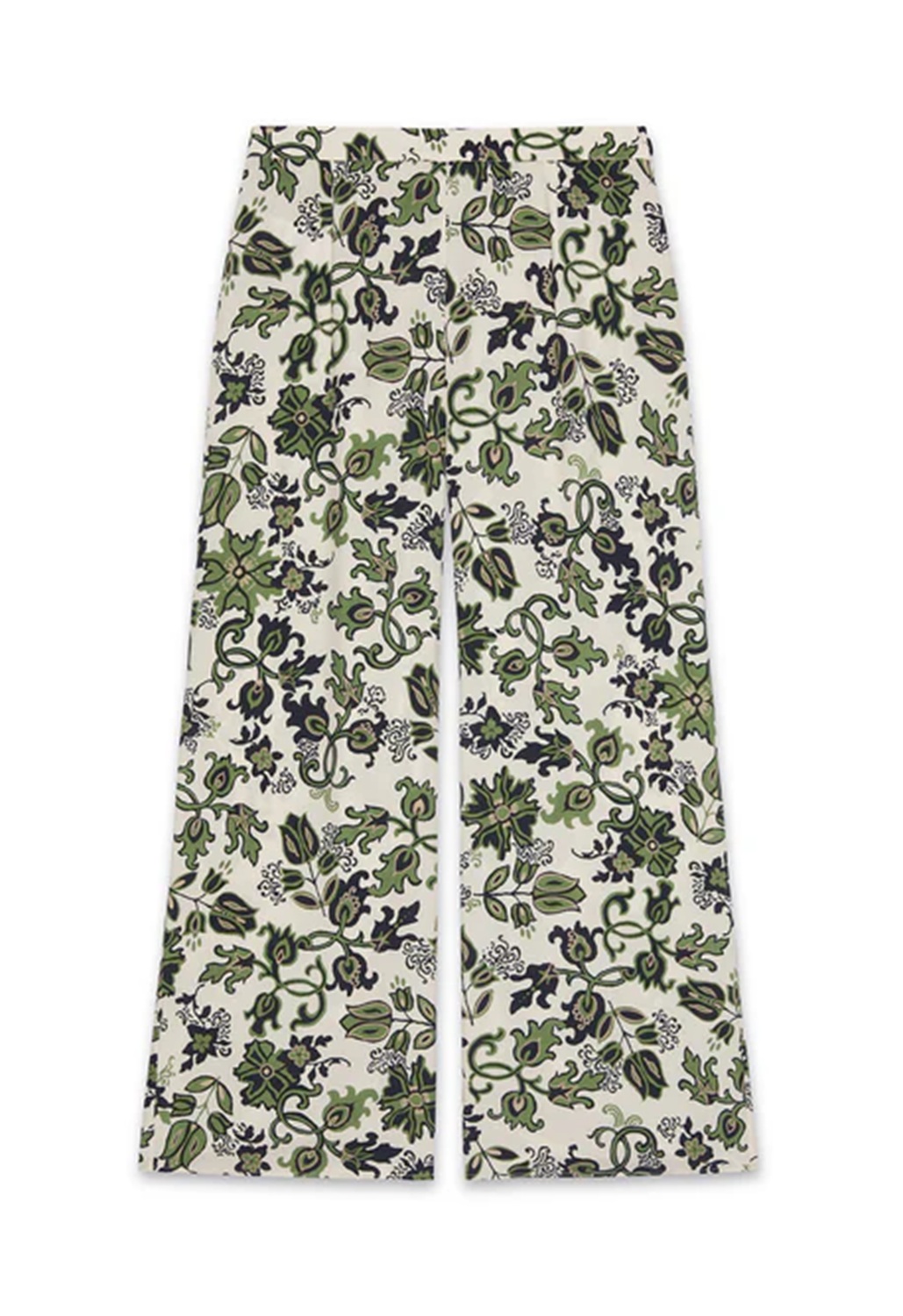 Pantalone palazzo vita alta con fascia elastica in vita. Stampa floreale all-over. Vestibilità scivolata.