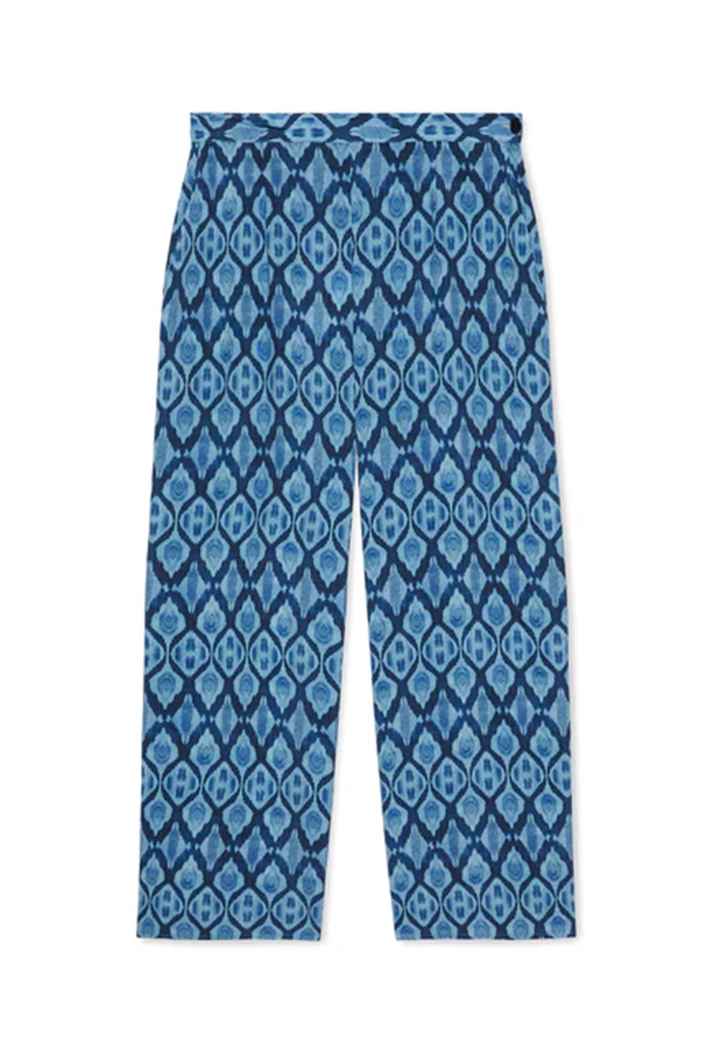 Pantalone palazzo vita alta con fascia elastica in vita. Vestibilità scivolata. Per una statura media, la lunghezza interna della gamba è 80-82 cm.