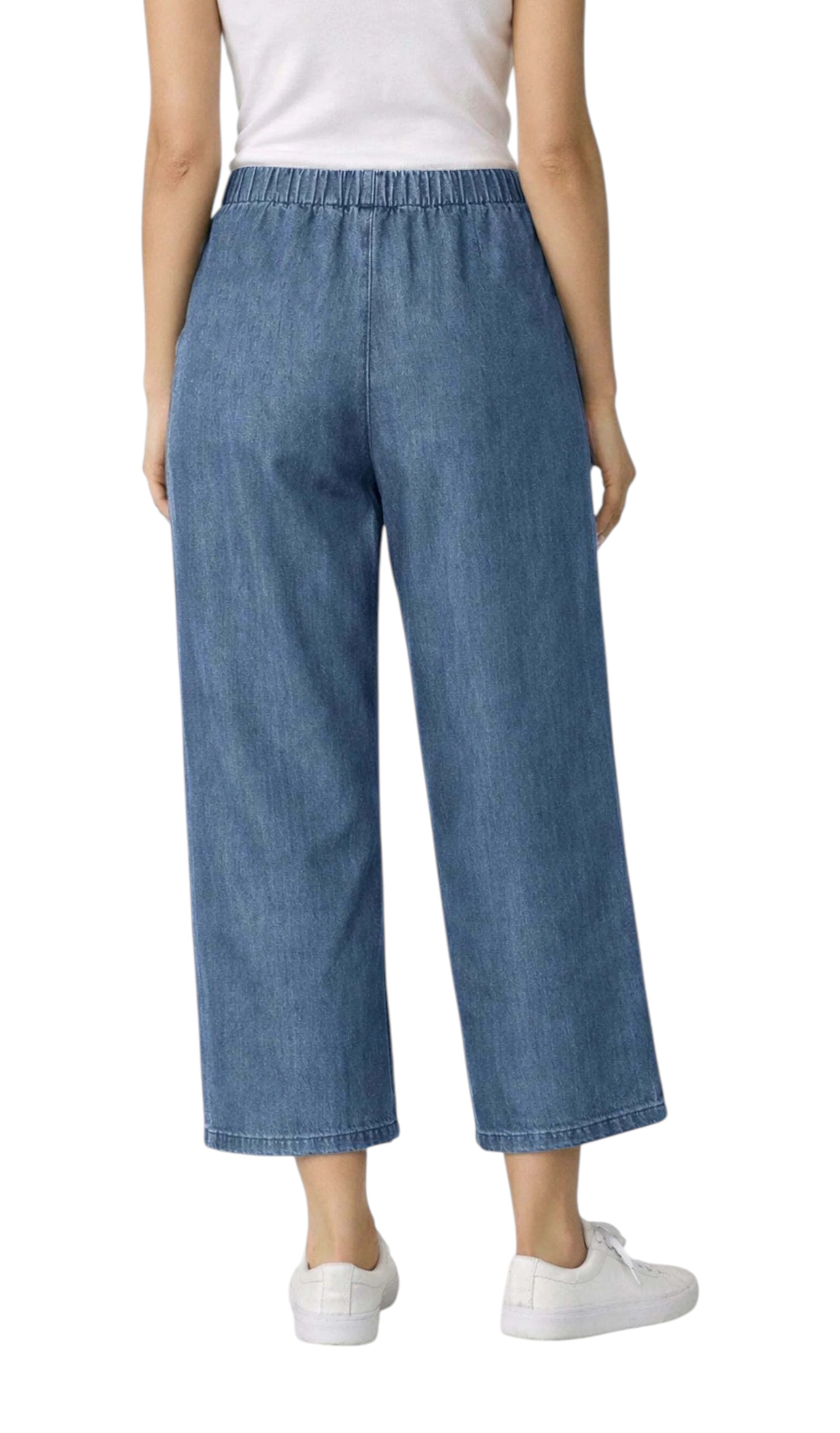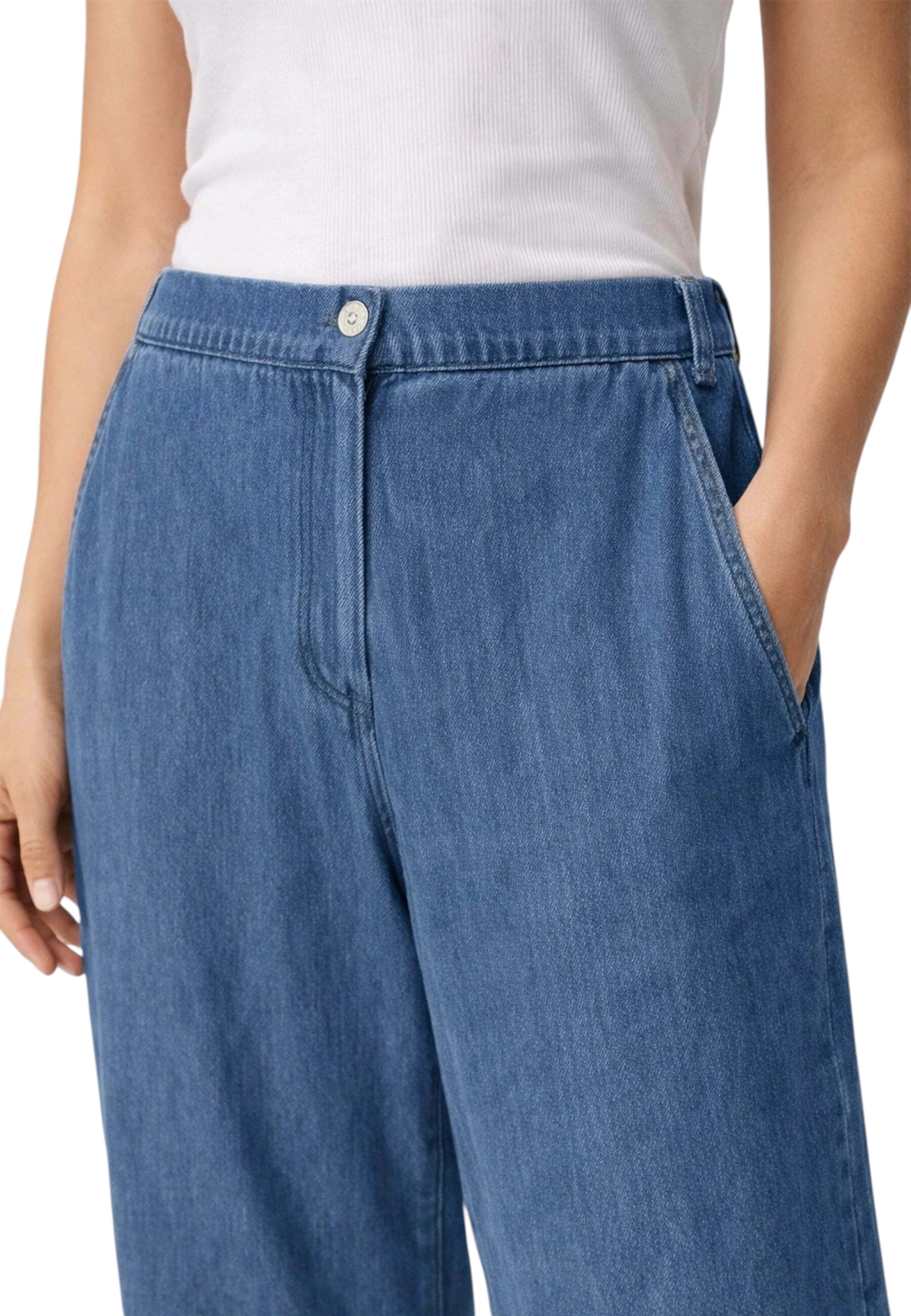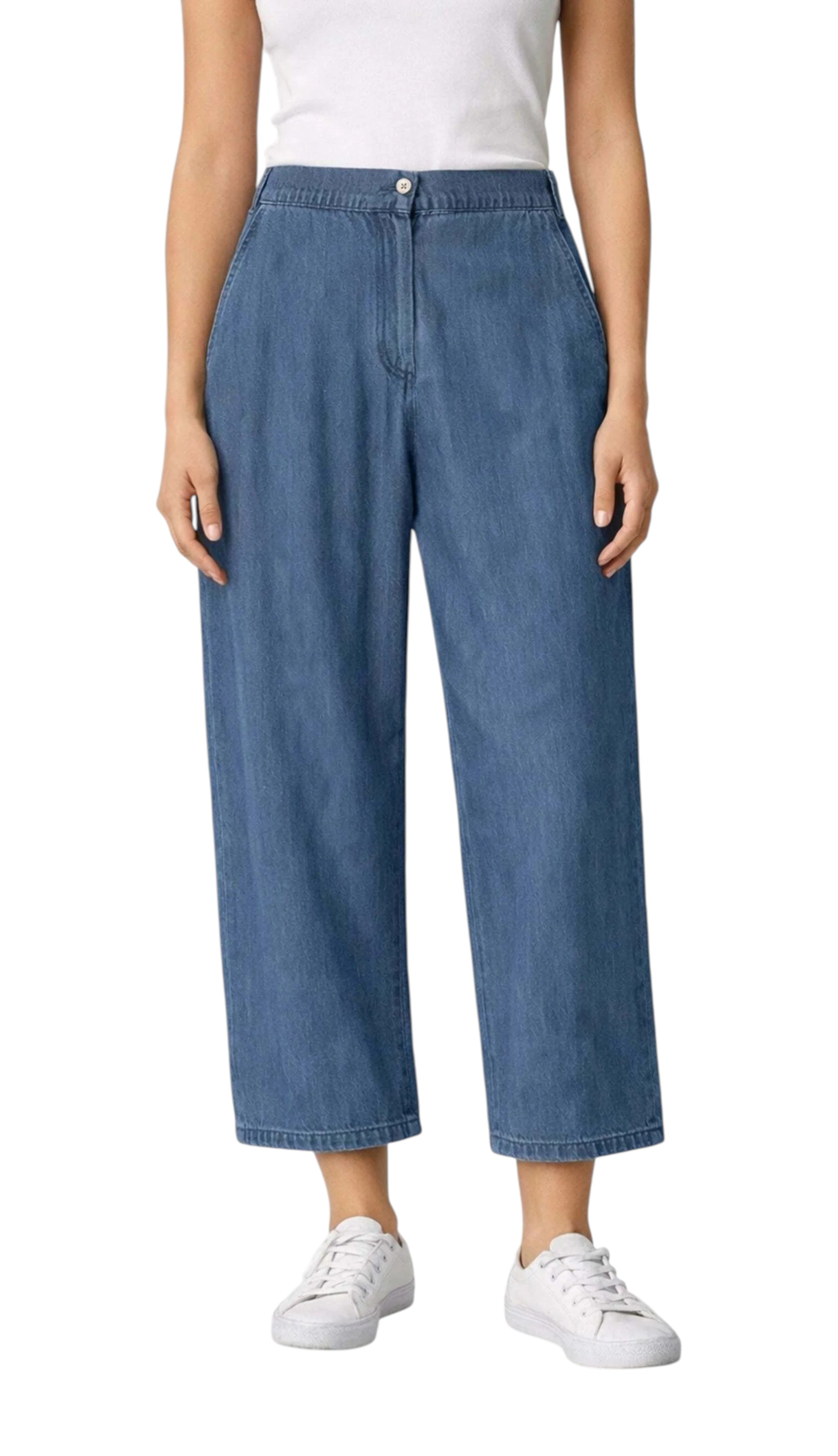 Pantalone con taglio a palazzo, vita alta con chiusura classica a bottone e zip tasche laterali. Lunghezza 7/8. Tessitura chambray effetto denim. Vestibilità fit. La modella è 1,70 cm e la lunghezza del pantalone è circa 68 cm.