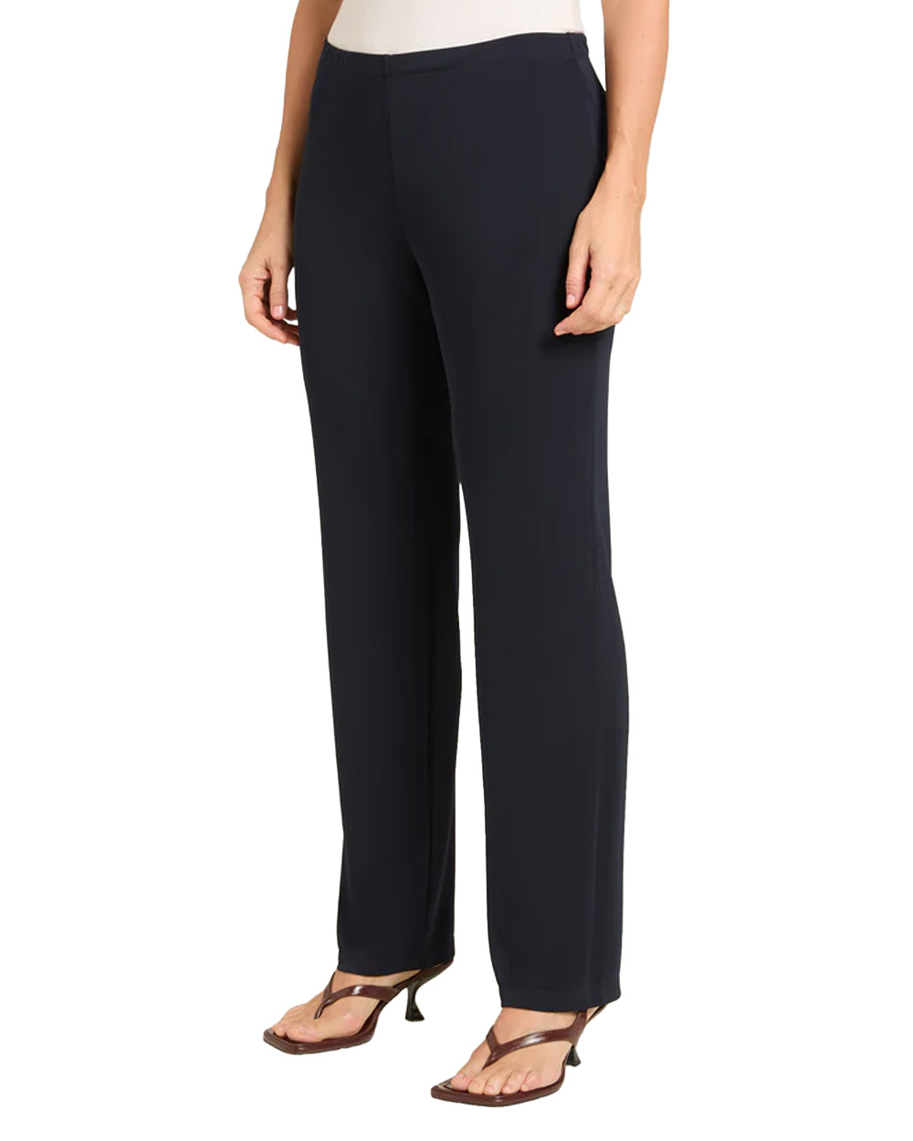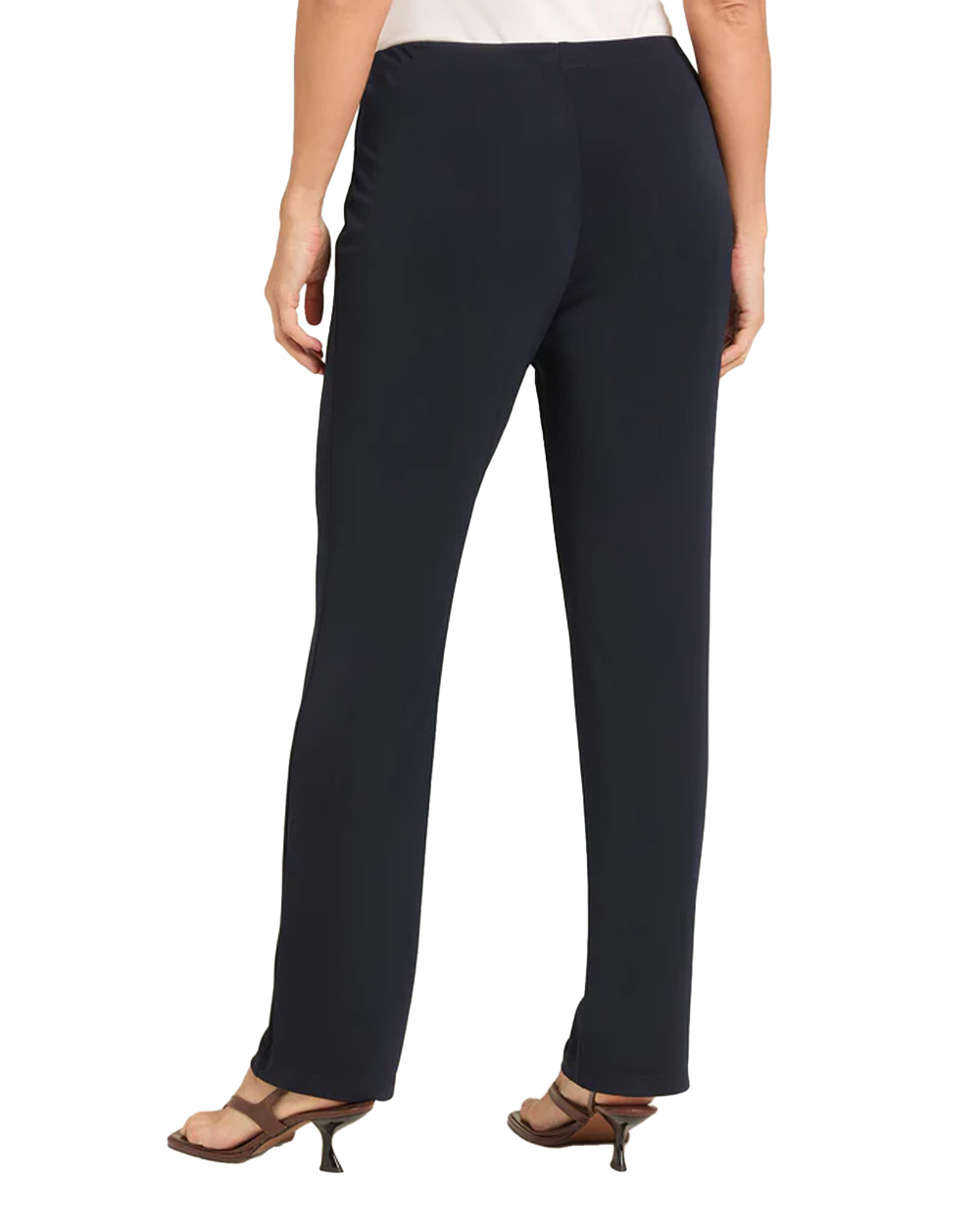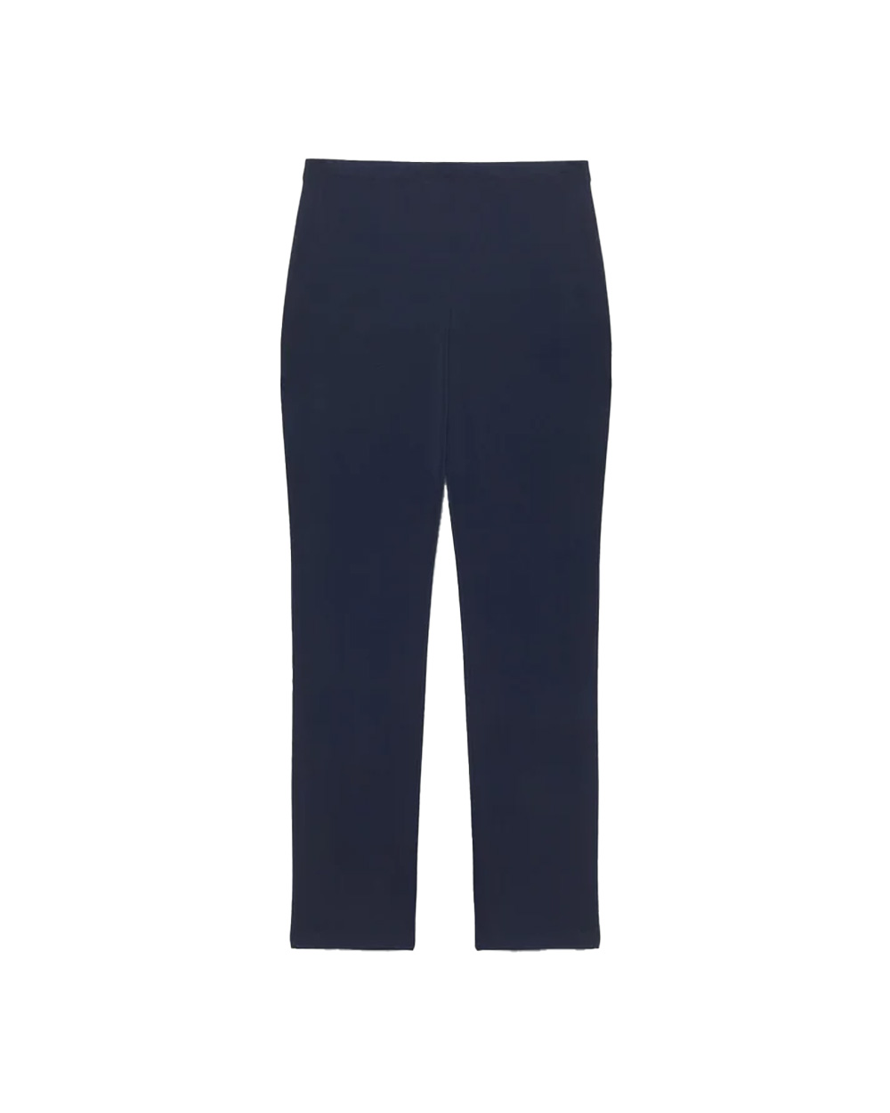Pantaloni con gamba dritta realizzati in un jersey fluido elasticizzato dall'aspetto serico e compatto. Punto vita regolare. Cinturino estensibile con gros grain elastico inserito all'interno. Costruzione Pull-On.