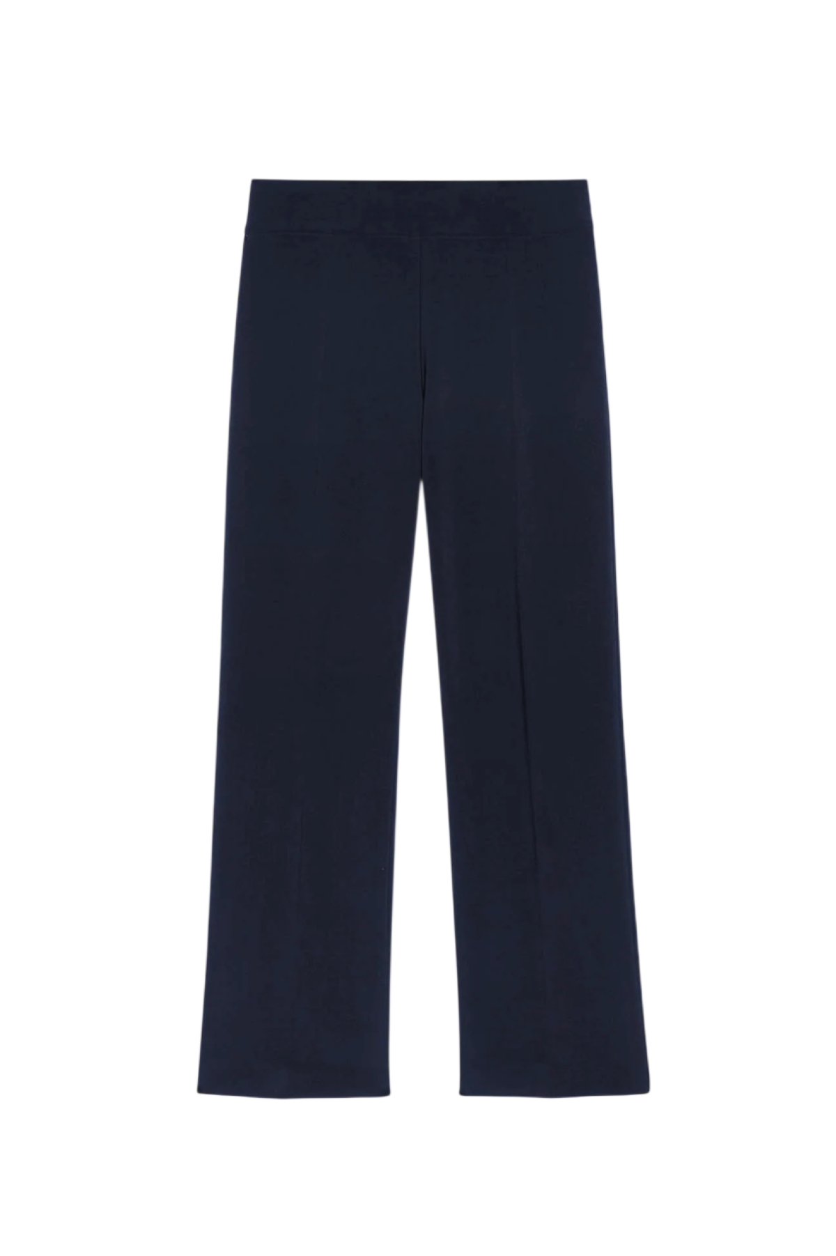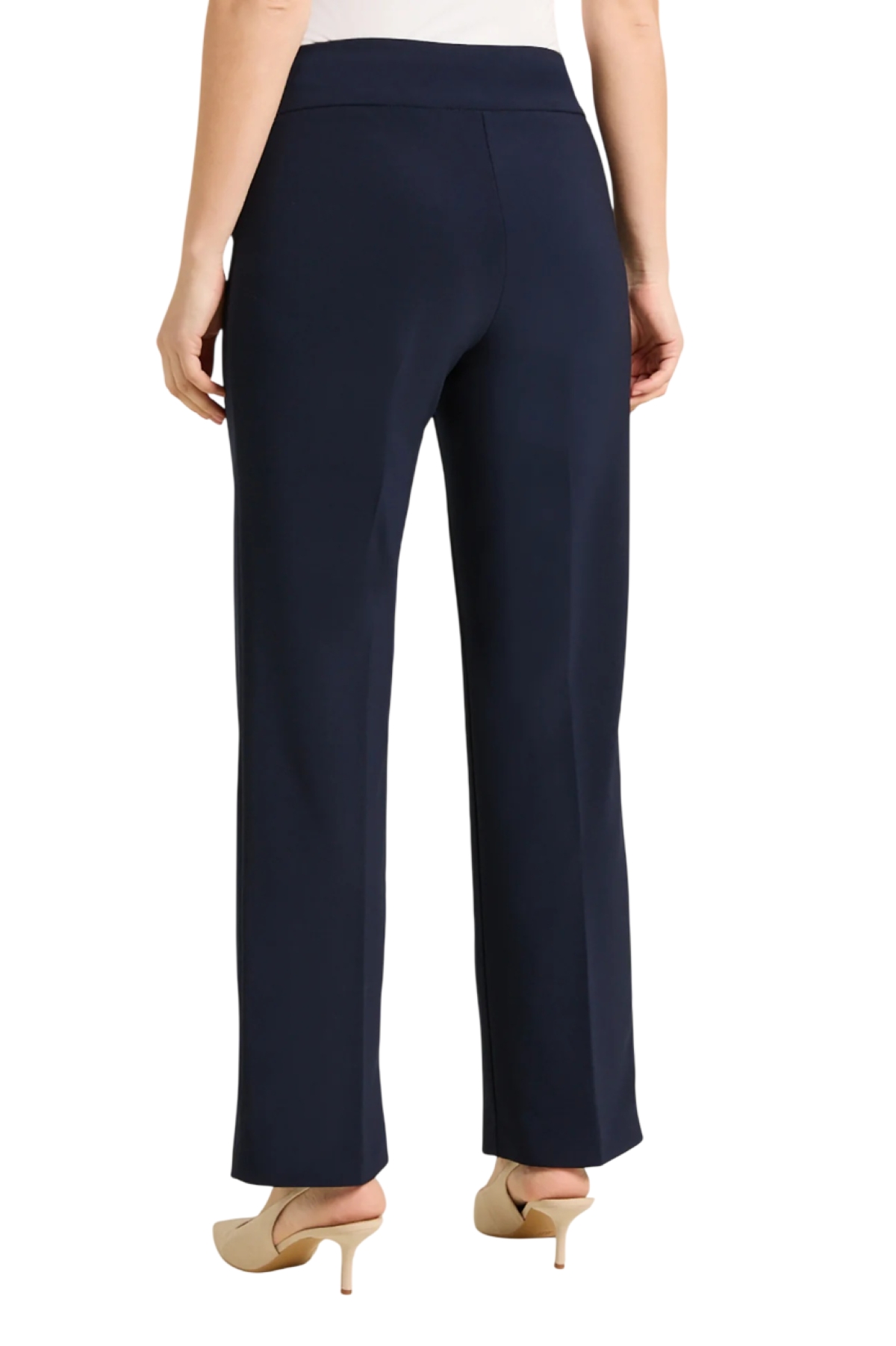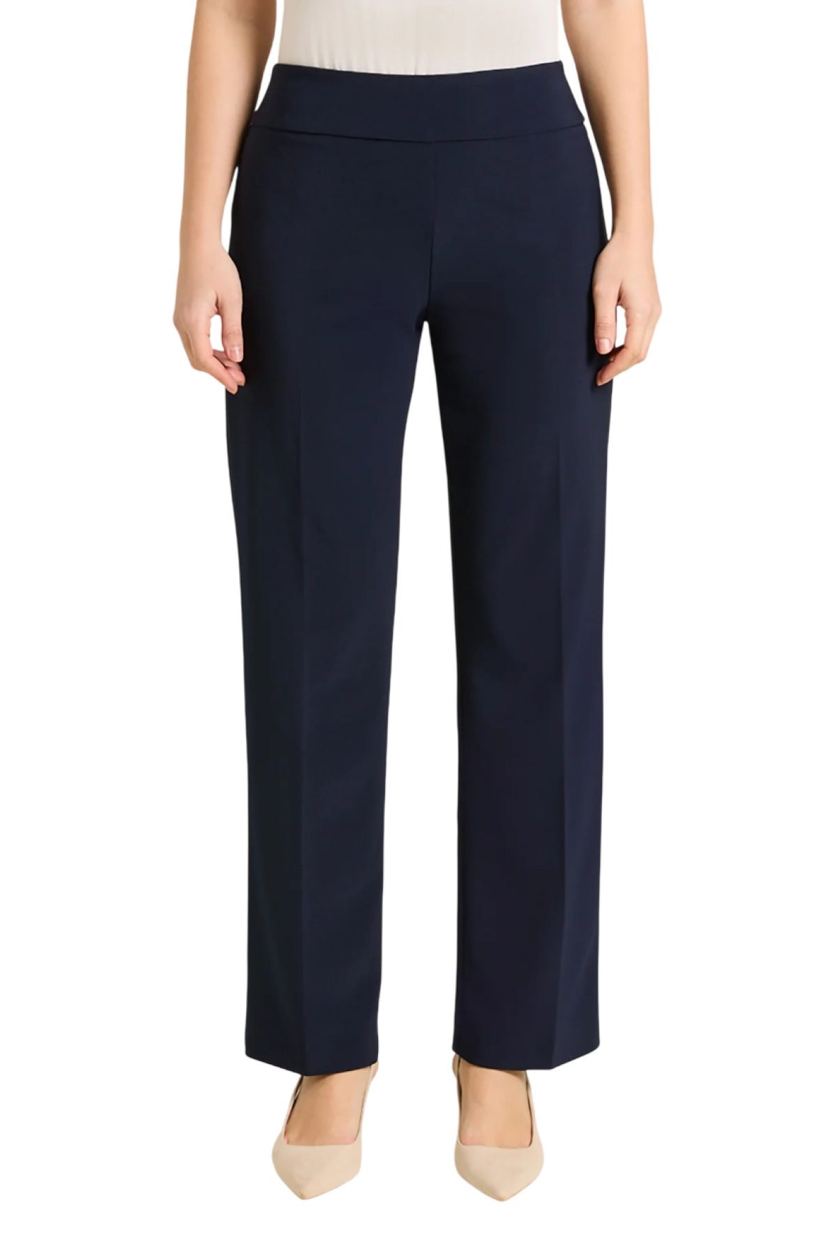 Pantaloni pull-on dritti elasticizzati, progettati per offrire il massimo comfort per silhouette curvy. Presenta una costruzione a sigaretta con spacchetti laterali al fondo e una lunghezza alla caviglia. Privo di zip e bottoni. Vita regolare con cintura estensibile grazie all'elastico inserito all'interno, tasche a filo e piega stirata che conferisce un aspetto sartoriale. Il capo si lava, si stende e si indossa senza la necessità di dover essere stirato.