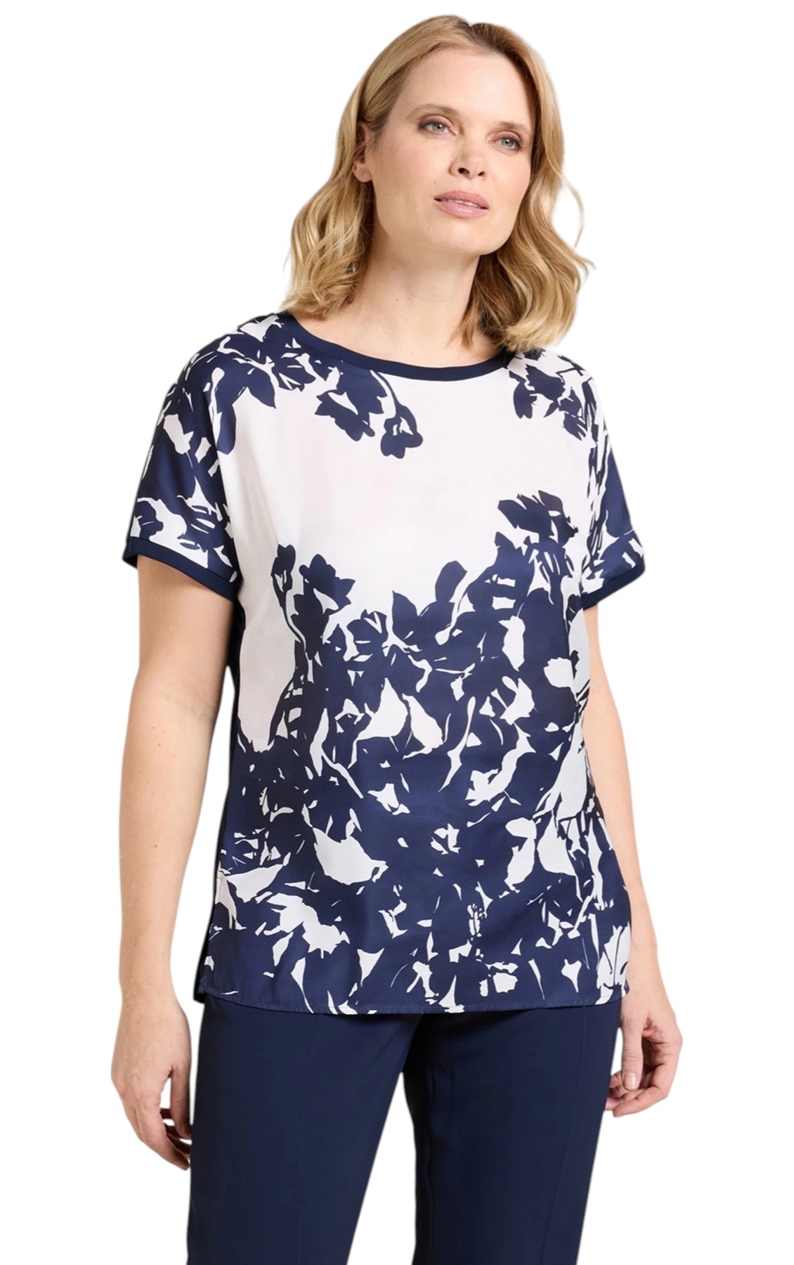 T-shirt scollo a girocollo profilato e maniche corte con bordo a contrasto. Davanti in crepe de chine. Realizzata in jersey tecnico. Appartiene alla linea "Lava, Stendi e Indossa". Vestibilità comoda.