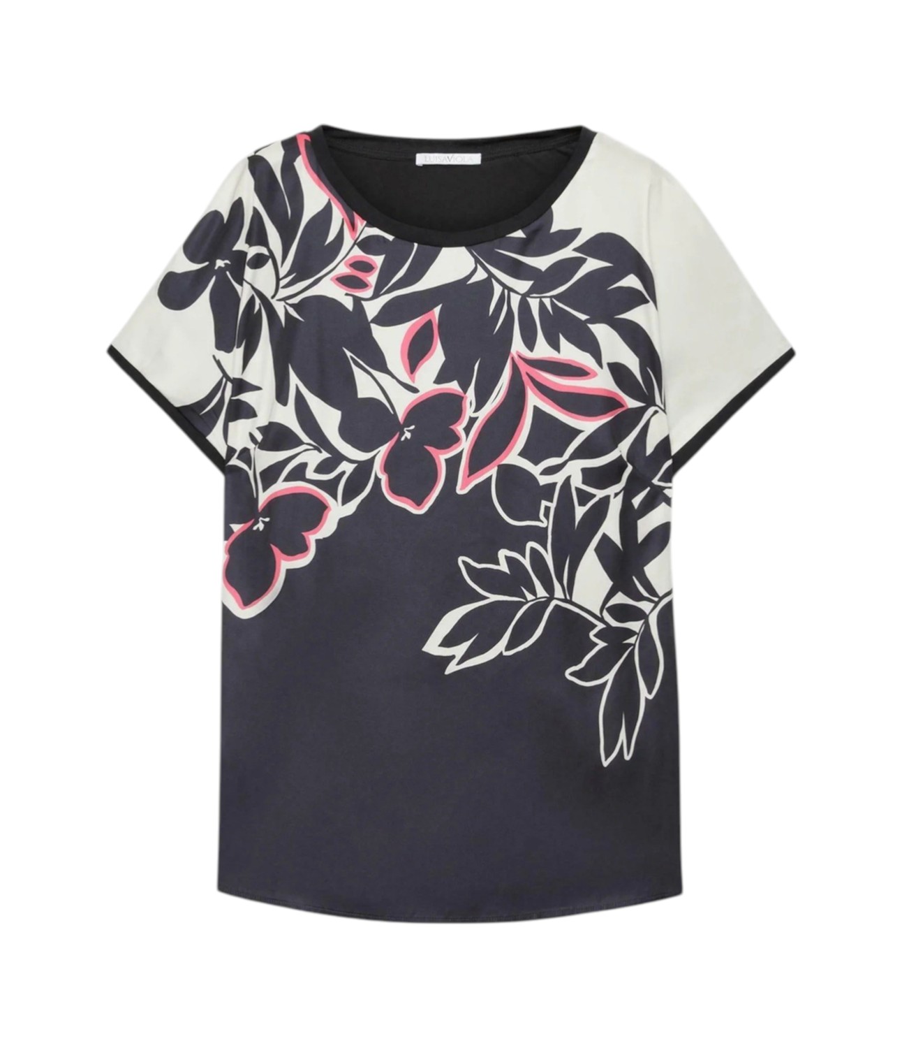 T-shirt scollo a girocollo profilato e maniche corte con bordo a contrasto caratterizzata da una fantasia floreale e foliage macro con contrasti in beige, nero e accenti rosa. Realizzata in jersey tecnico. Appartiene alla linea "Lava, Stendi e Indossa". Vestibilità comoda.