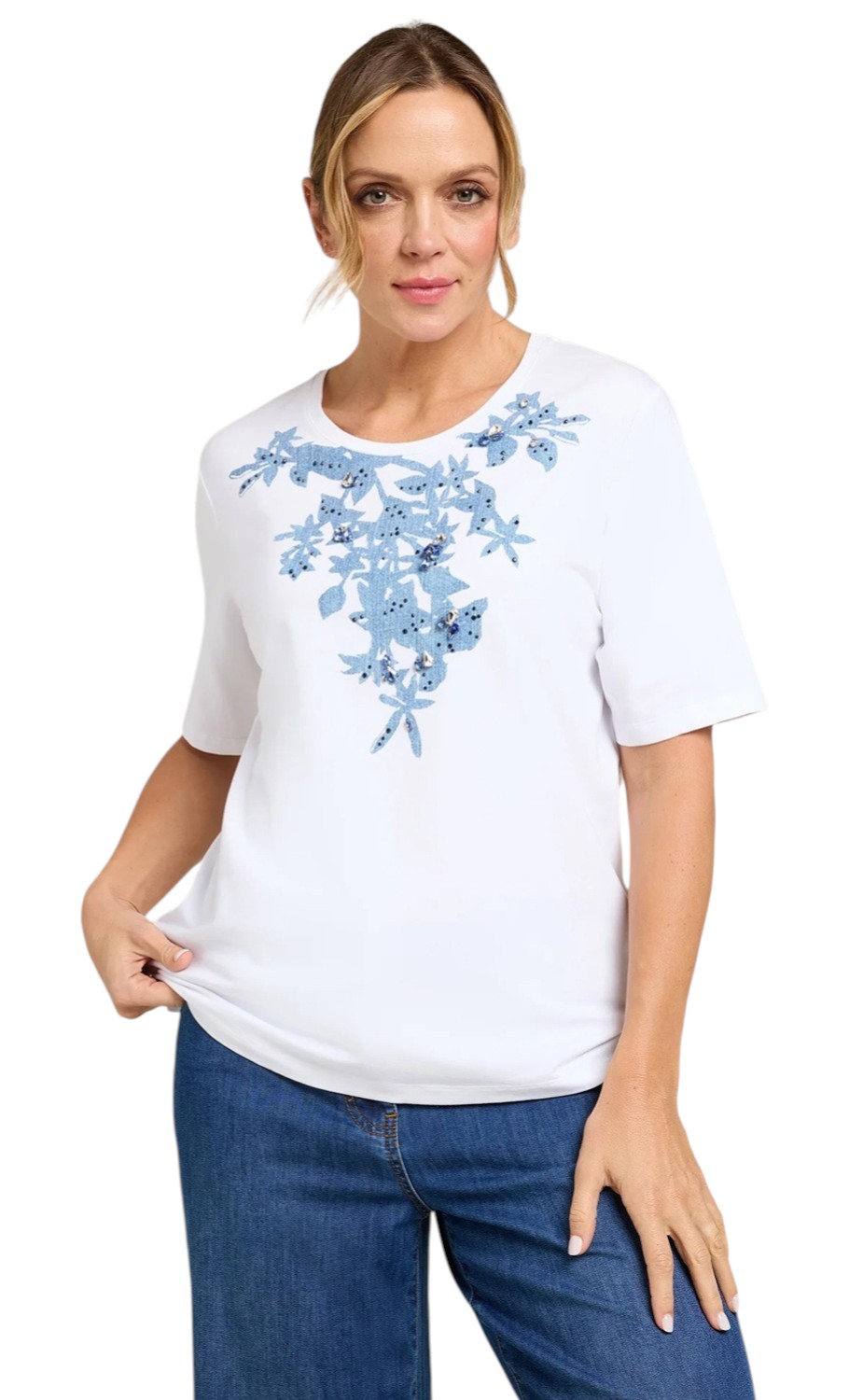 T-shirt in jersey di cotone stampato stretch con scollo rotondo e manica corta. Caratterizzata da un ramage stampato con effetto jeans, impreziosito da piccoli strass e castoni in vetro applicati a mano, crystal e zaffiro.