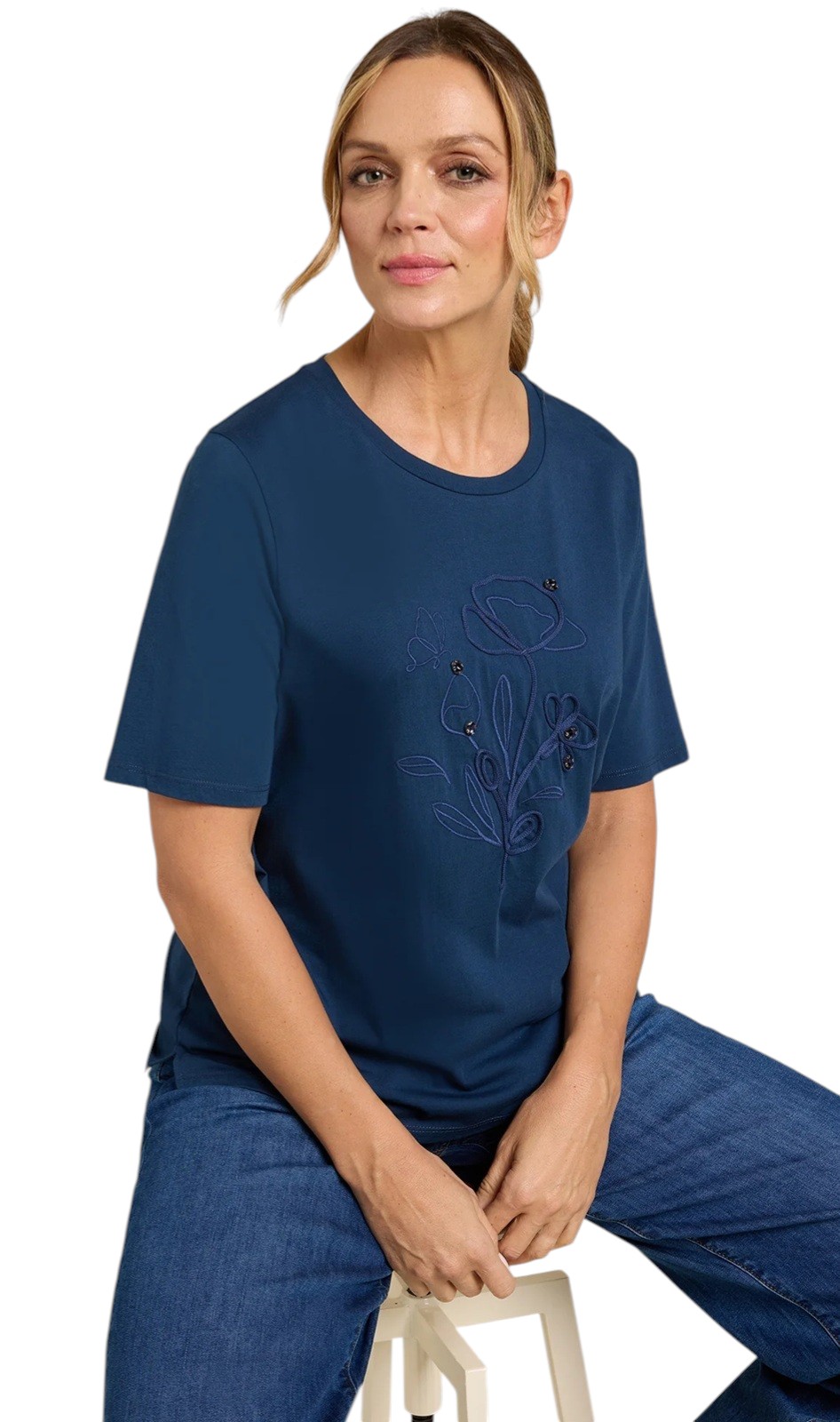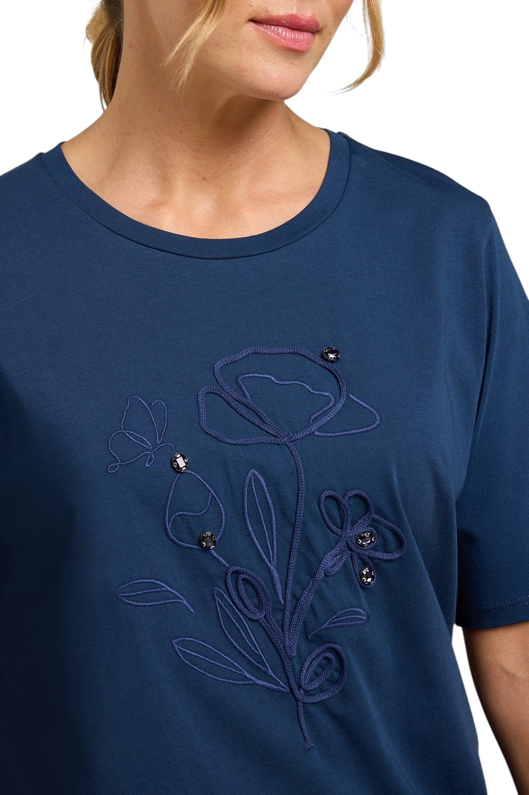 T-shirt in jersey di puro cotone con scollo rotondo e manica corta. Ricamo cornelly tono su tono con castoni in vetro applicati a mano.