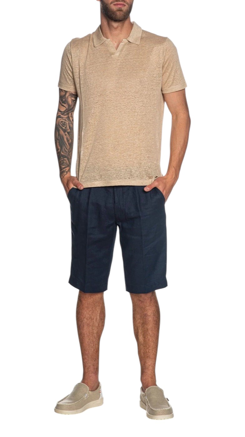 Bermuda Markup Reg Linen da uomo in tessuto di puro lino, modello chino regular fit con chiusura zip coperta, tasche laterali america, tasche posteriori a filo con bottone e piccola placchetta logo in acciaio su un lato.