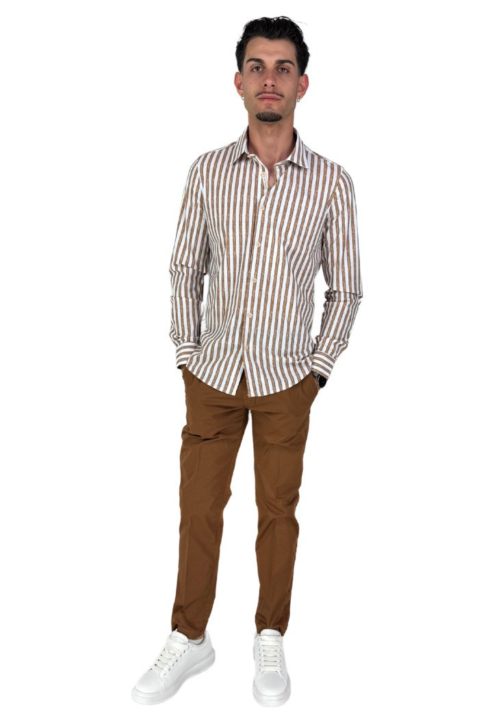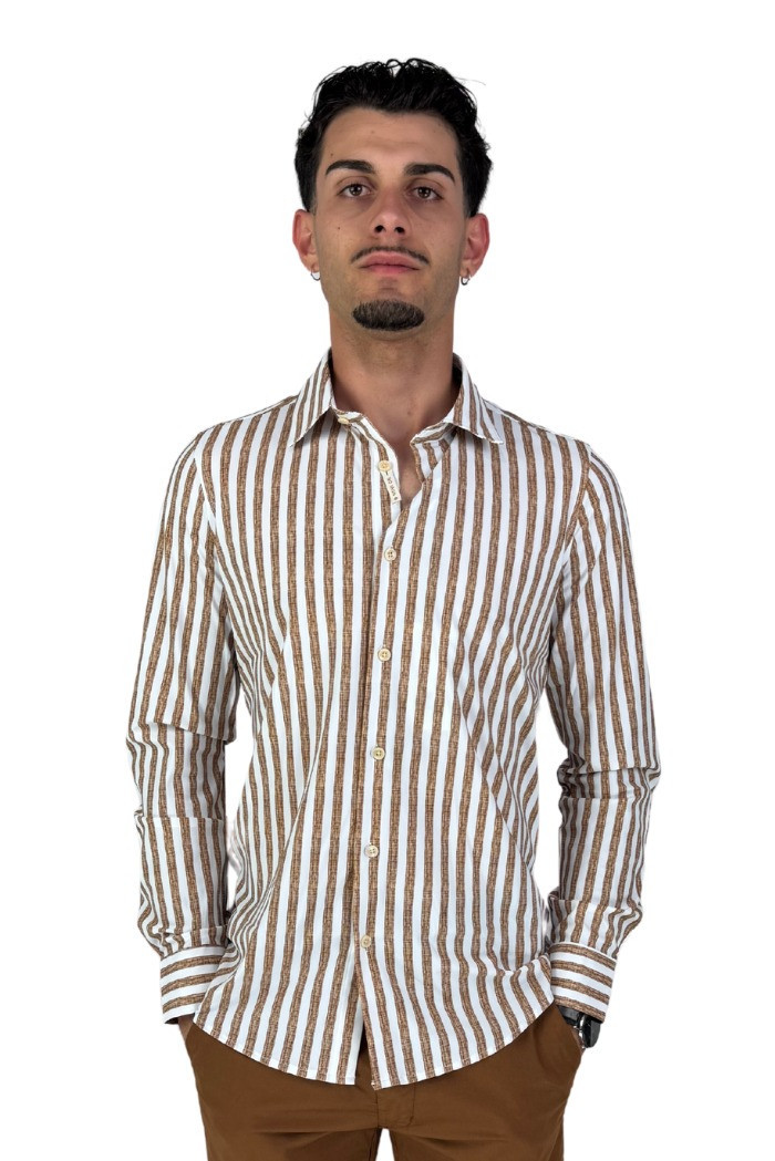 Camicia da uomo a righe verticali tabacco con collo italiano e maniche lunghe. Modello elegante e versatile, perfetto per look formali e casual-chic. Chiusura frontale con bottoni e fondo stondato. Il design a righe dona slancio alla figura, mentre la vestibilità regolare assicura comfort durante tutta la giornata.