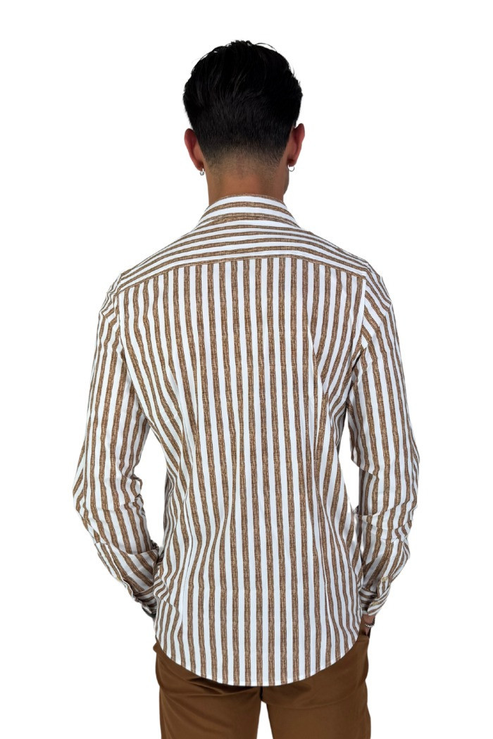 Camicia a Righe color tabacco con Collo Italiano e Maniche Lunghe