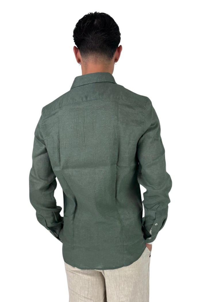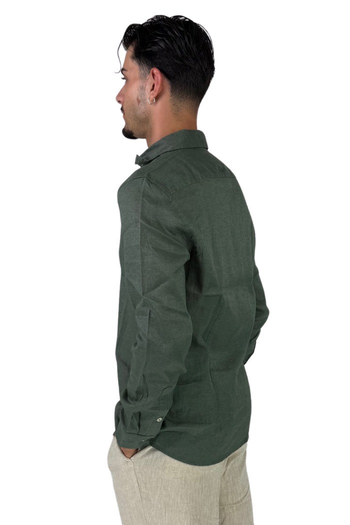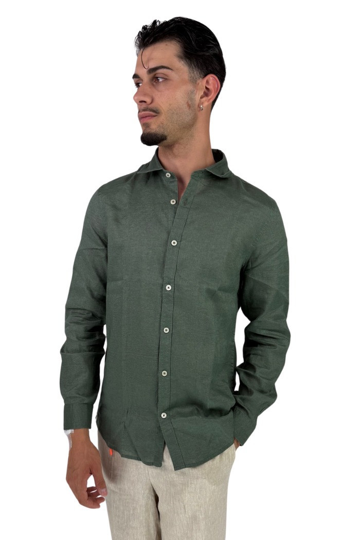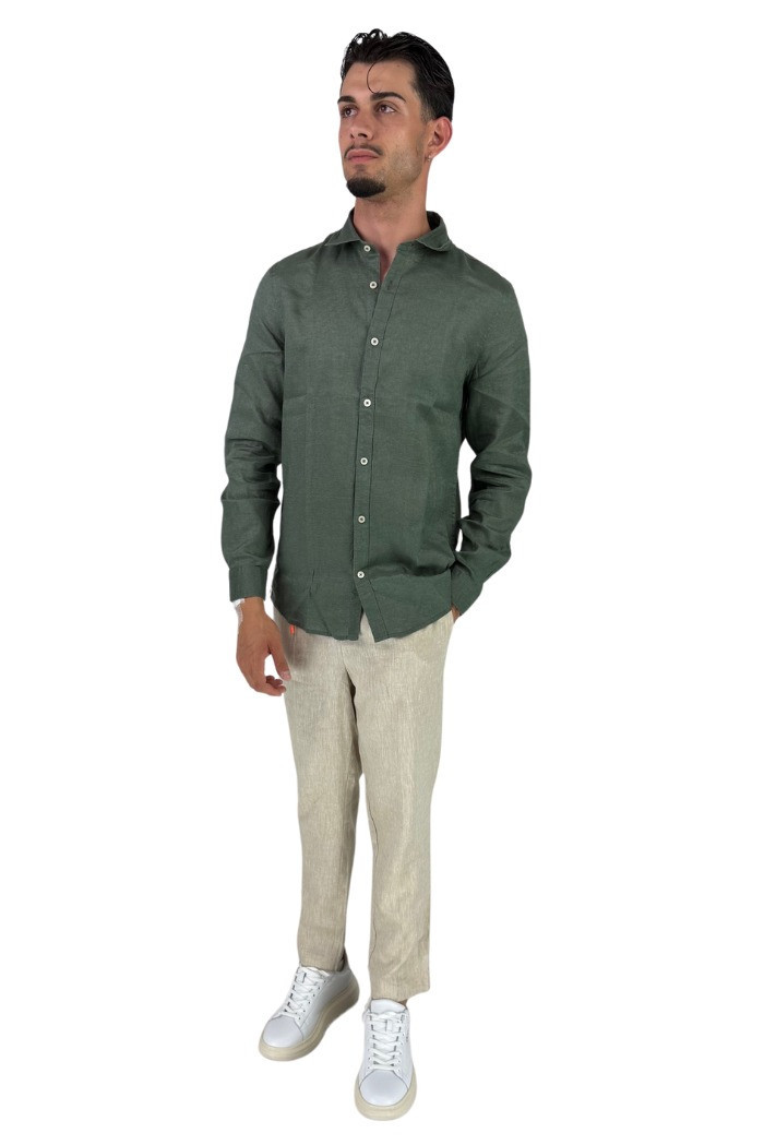 Camicia verde militare da uomo in puro lino con collo italiano e maniche lunghe. Chiusura frontale con bottoni e polsini abbottonati. Tessuto leggero e traspirante, ideale per la stagione calda