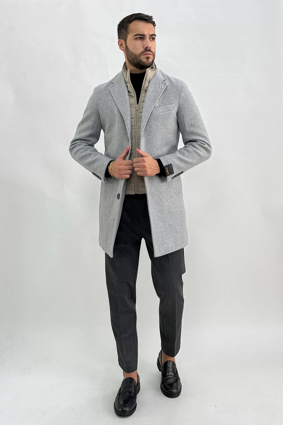 Cappotto Markup da uomo in elegante tessuto grigio melange, con chiusura a tre bottoni e pettorina interna estraibile con zip per una maggiore versatilità. Dotato di imbottitura fissa e due tasche esterne, offre calore e comfort durante la stagione fredda. Il taglio classico e la linea pulita lo rendono perfetto per outfit formali e casual.