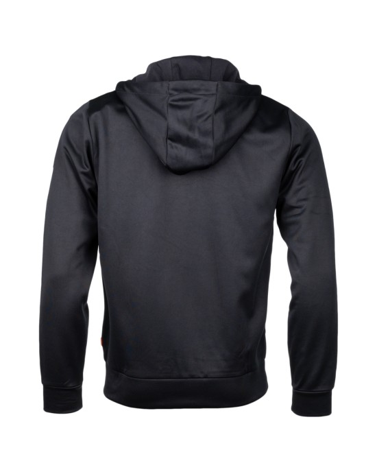 Felpa da uomo in tessuto tecnico nero, con cappuccio regolabile e chiusura a zip frontale. Presenta tasche laterali con zip e dettaglio logato sulla manica. Il tessuto elasticizzato garantisce comfort e libertà di movimento, rendendola ideale per il tempo libero e gli outfit sportivi contemporanei.