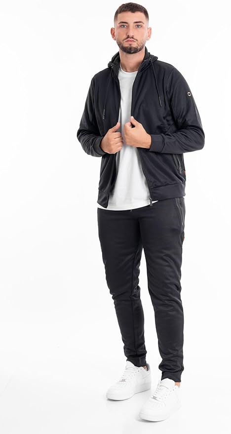 Felpa da uomo in tessuto tecnico nero, con cappuccio regolabile e chiusura a zip frontale. Presenta tasche laterali con zip e dettaglio logato sulla manica. Il tessuto elasticizzato garantisce comfort e libertà di movimento, rendendola ideale per il tempo libero e gli outfit sportivi contemporanei.