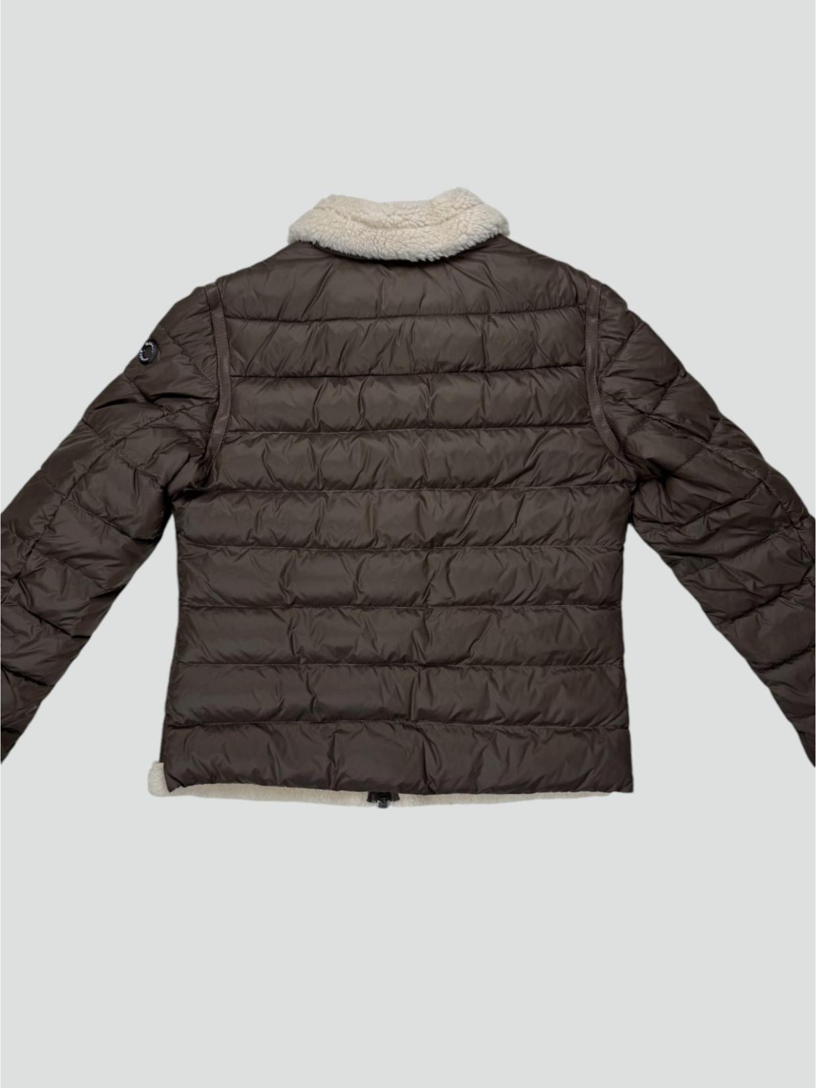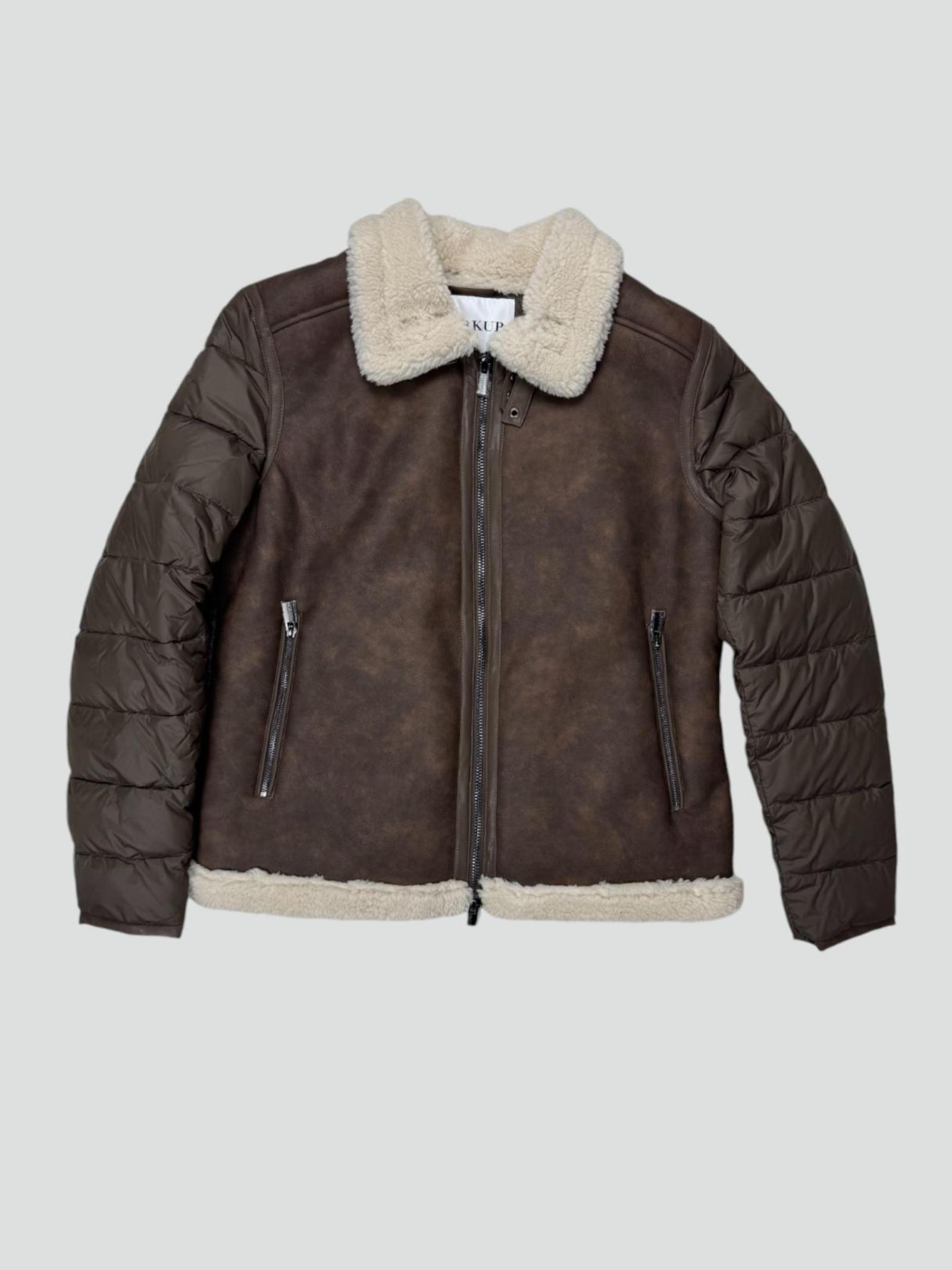 Giubbino uomo modello aviatore Mark-up con collo e interno in ecopelliccia, maniche e retro modello piumino, due tasche esterne, chiusura a zip e chiusura collo con due cinturini.