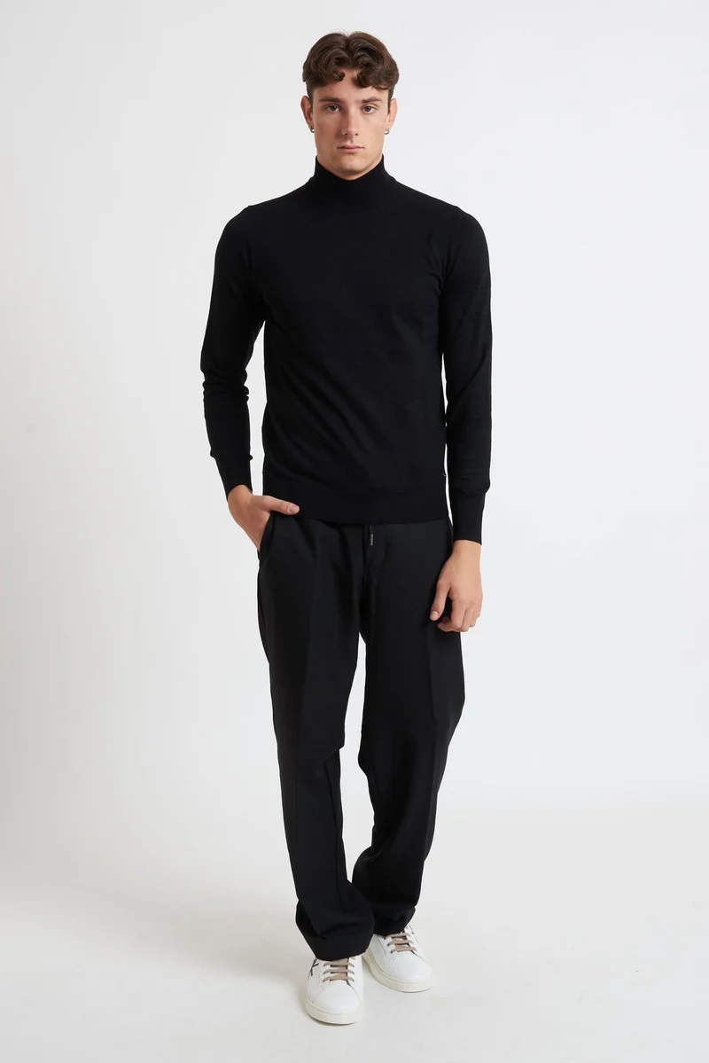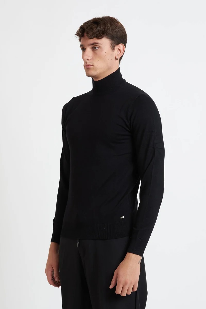 Lupetto da uomo Markup nero realizzato in filato finezza 12 con composizione viscose blend che garantisce morbidezza, comfort e uneccellente vestibilità. Il design pulito con collo alto a coste e finiture elasticizzate su polsini e fondo lo rendono un capo versatile, ideale da indossare sotto giacche o cappotti durante la stagione fredda.
