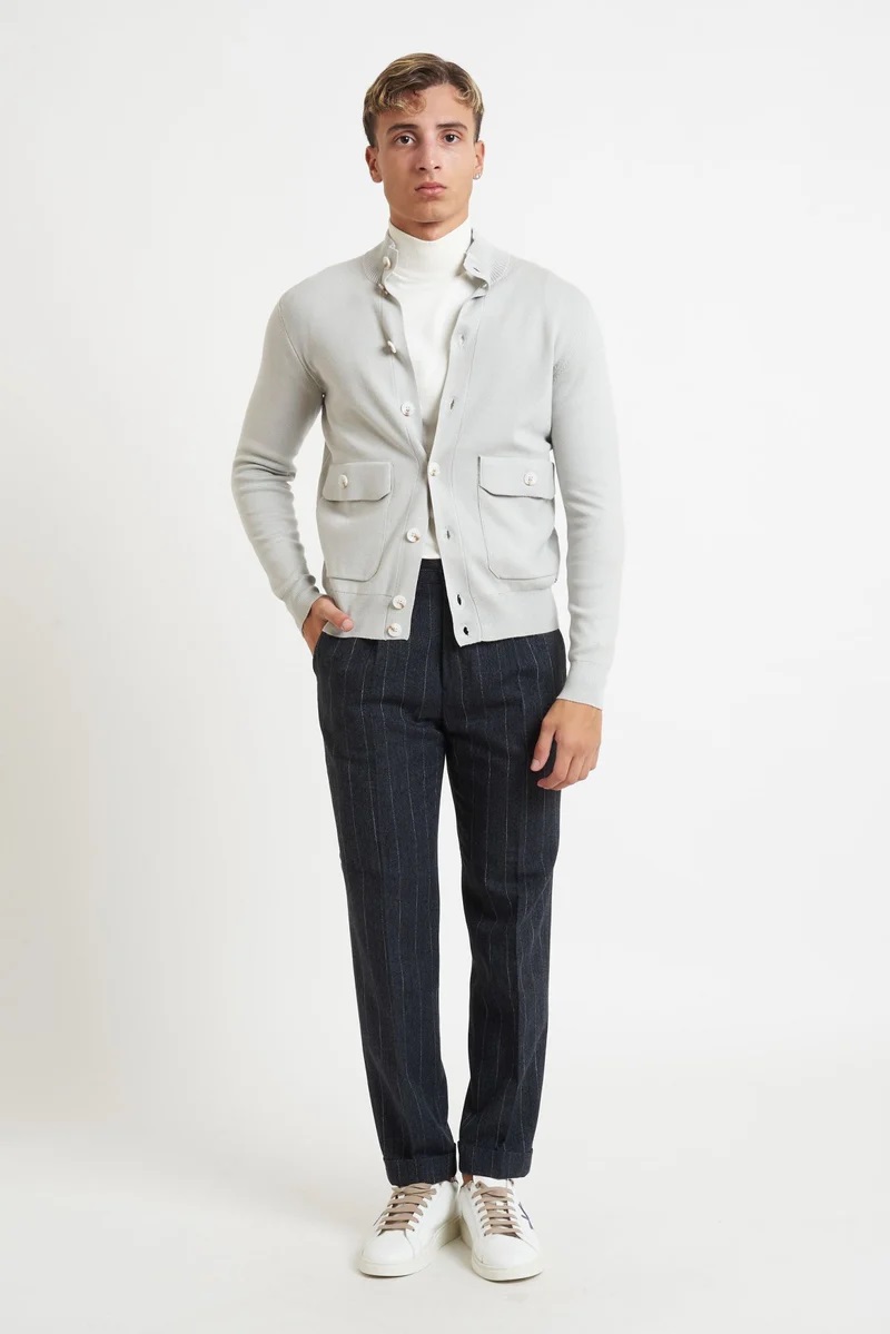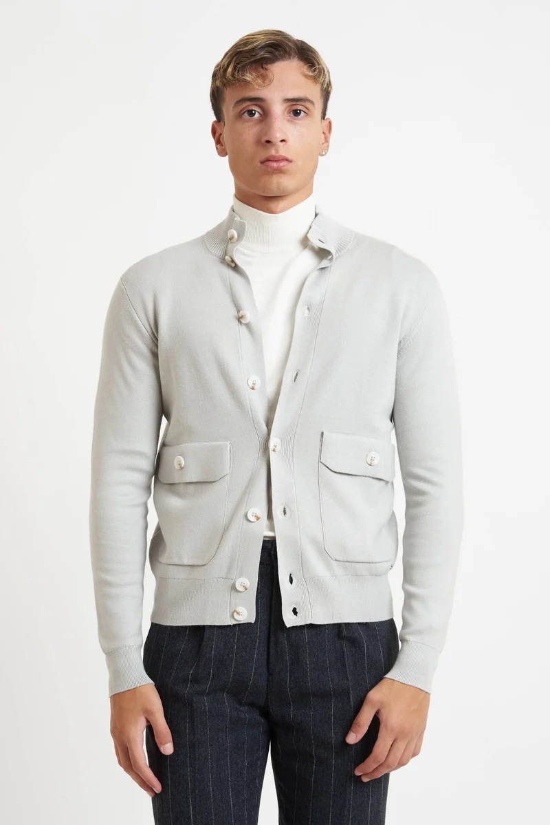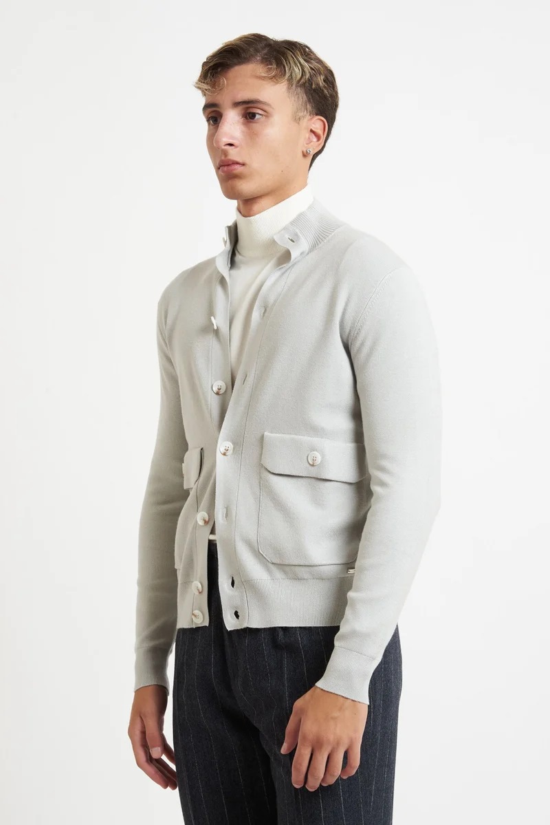La maglia da uomo Markup in colore titanio è realizzata in filato di viscosa finezza 12 con lavorazione punto stoffa, che assicura una mano morbida e compatta. Il modello, dal taglio elegante e moderno, presenta collo alto con abbottonatura completa, due tasche frontali con patta e bottone e bordi a costine su fondo e polsini. Perfetta da indossare come giacca leggera o come maglia raffinata per un look casual chic. Composizione: 80% viscosa, 20% nylon Finezza: 12
