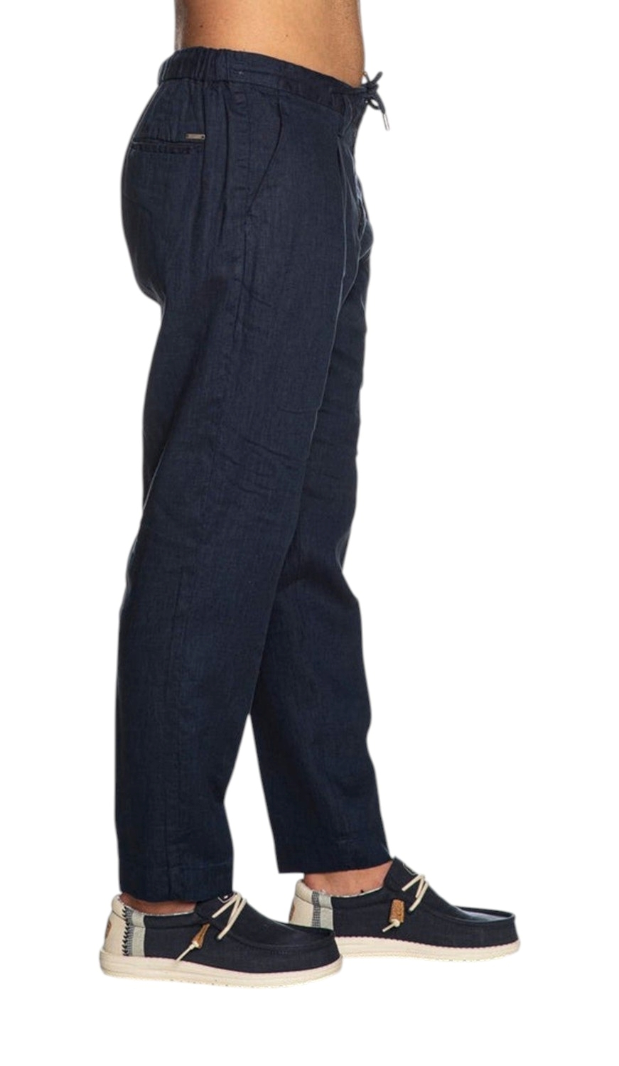 Pantalaccio in tessuto di puro lino modello chino regular fit, con chiusura zip coperta e coulisse in vita, pinces, tasche laterali america e tasche posteriori a filo con piccola placchetta logo in acciaio applicata su un lato.