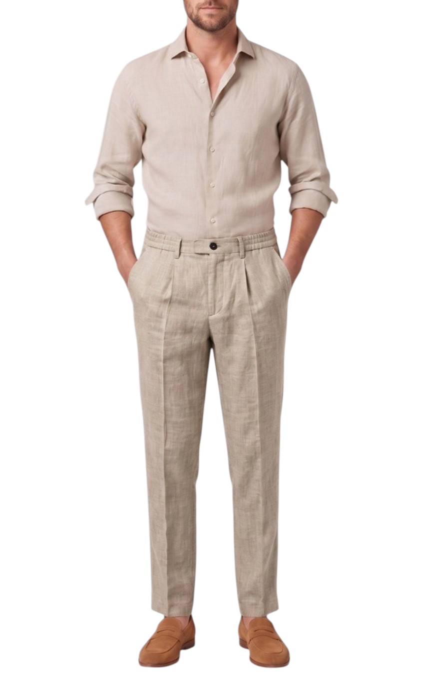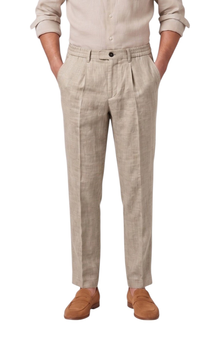Pantalone da uomo con vita elasticizzata e dotata di laccio regolabile. Realizzato in lino leggero e traspirante. Dispone di una chiusura con zip coperta e bottone, oltre a classiche tasche laterali e posteriori a filetto. Il modello in foto è alto 180cm ed indossa la taglia 46. Regular fit. Vita media.