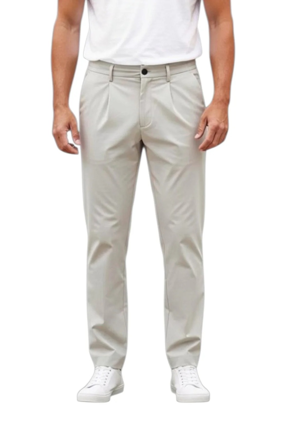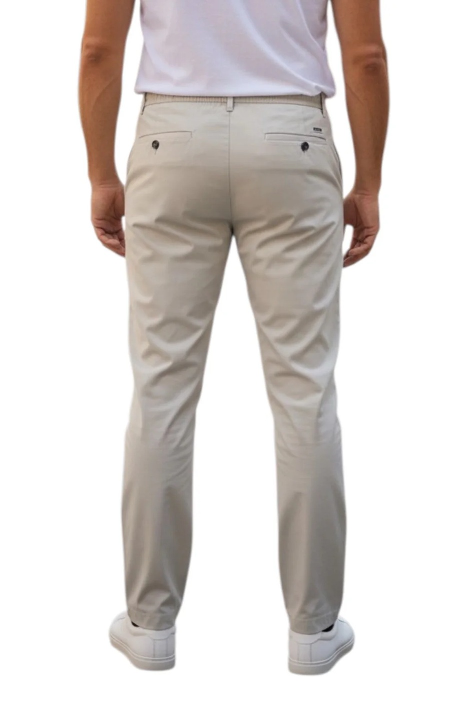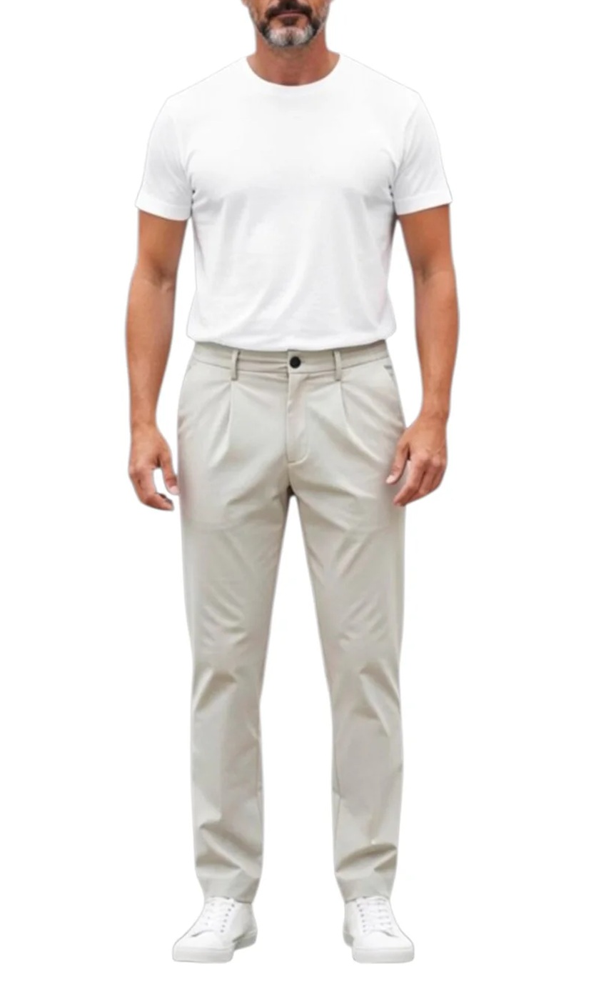 Pantalone da uomo in tessuto tech no stiro con vita elasticizzata con laccio e pences. Realizzato in nylon stretch. Tasche anteriori a filo verticale, posteriori due tasche a doppio filetto. Nonostante la coulisse, ha una vera patta con zip nascosta e un bottone a pressione. Vestibilità slim, con fondo gamba leggermente stretto. Si consiglia una taglia in più.