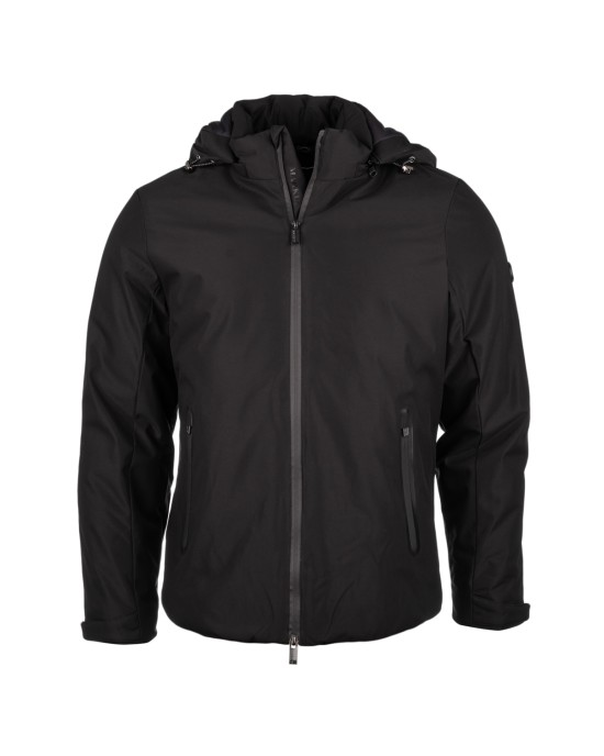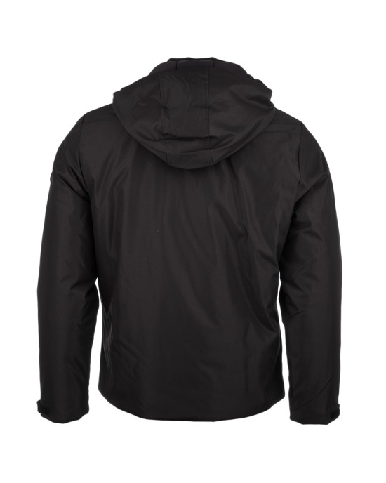 Parka da uomo in tessuto tecnico impermeabile color nero, con cappuccio regolabile e maniche dotate di chiusura a strappo. Chiusura frontale con zip a contrasto, patch logo applicato sul braccio sinistro e tasche laterali con chiusura a zip. Un capo resistente allacqua, ideale per affrontare le giornate più fredde e piovose con stile e comfort.
