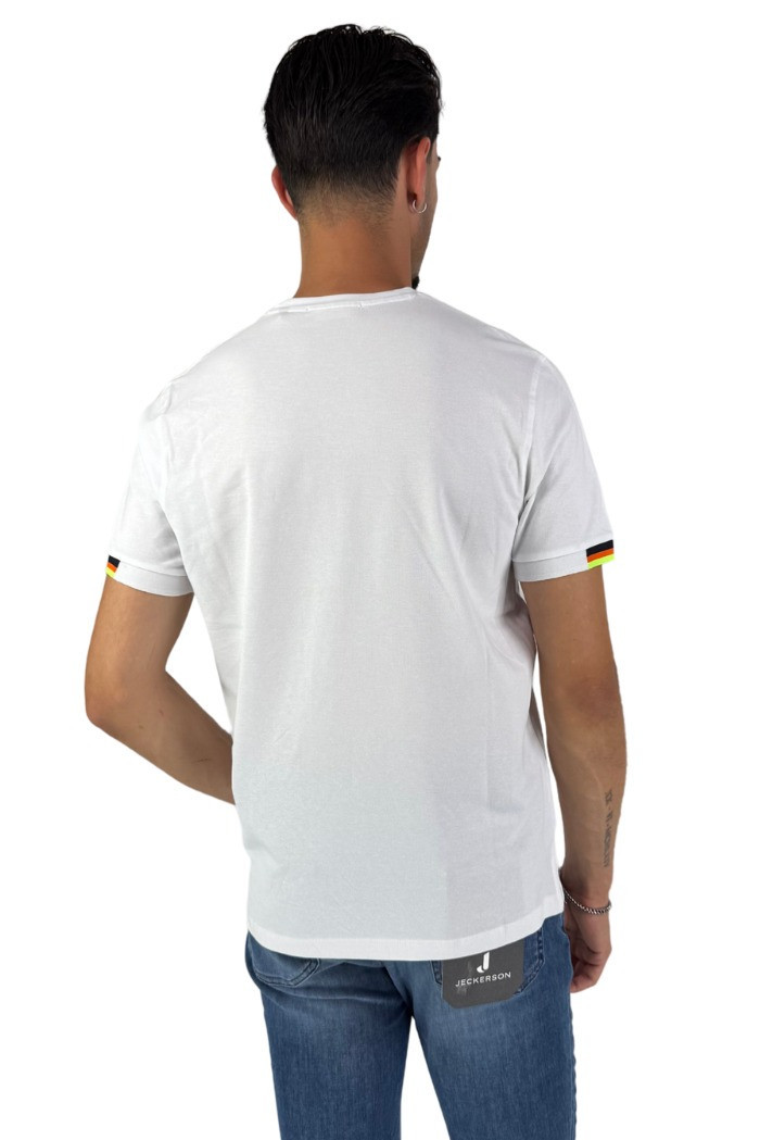 t-shirt bianca girocollo con taschino realizzata in piquet leggermente elastico con dettagli a contrasto.