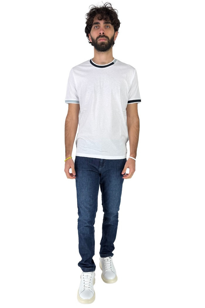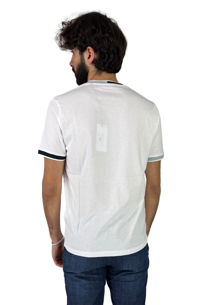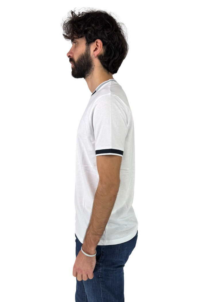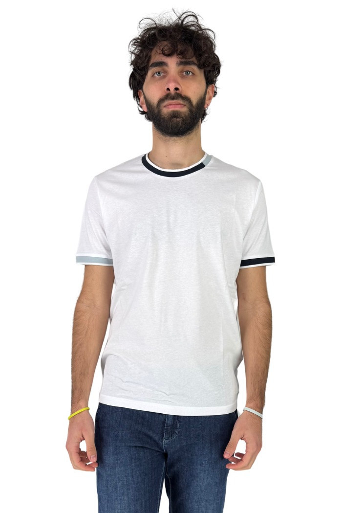 T-shirt da uomo in jersey di cotone bianco con scollo girocollo. Dettagli a contrasto su collo e polsi nelle tonalità del blu e azzurro, che donano al capo un tocco moderno e raffinato. Vestibilità regolare, ideale per look casual con un accento grafico discreto.