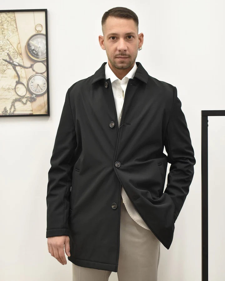 Il trench da uomo Markup in softshell nero è un capo versatile e raffinato, ideale per la mezza stagione. Realizzato in tessuto tecnico softshell con interno in pile caldo e morbido, assicura protezione da vento e pioggia leggera mantenendo un look elegante. Il design classico con chiusura a bottoni, colletto a camicia e tasche laterali oblique ne fa un must-have del guardaroba maschile contemporaneo, perfetto per luso quotidiano e il tempo libero.