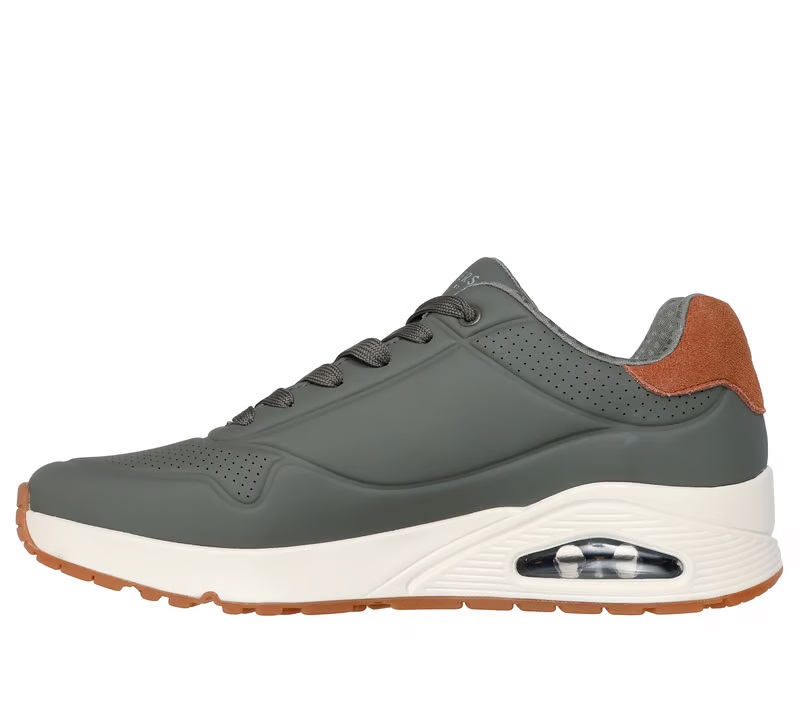 Sneakers "UNO - Suited On Air" color oliva firmate Skechers Street, che combinano stile sportivo e comfort superiore. Il modello da jogging presenta una tomaia in durabuck con dettagli impressi e finitura in pelle scamosciata sul tallone, allacciatura classica e soletta Skechers Air-Cooled Memory Foam® per unammortizzazione ottimale. Lintersuola con tecnologia visibile Skech-Air® garantisce massima leggerezza e comfort, mentre la suola flessibile assicura stabilità e trazione. Altezza tacco: 3,8 cm.