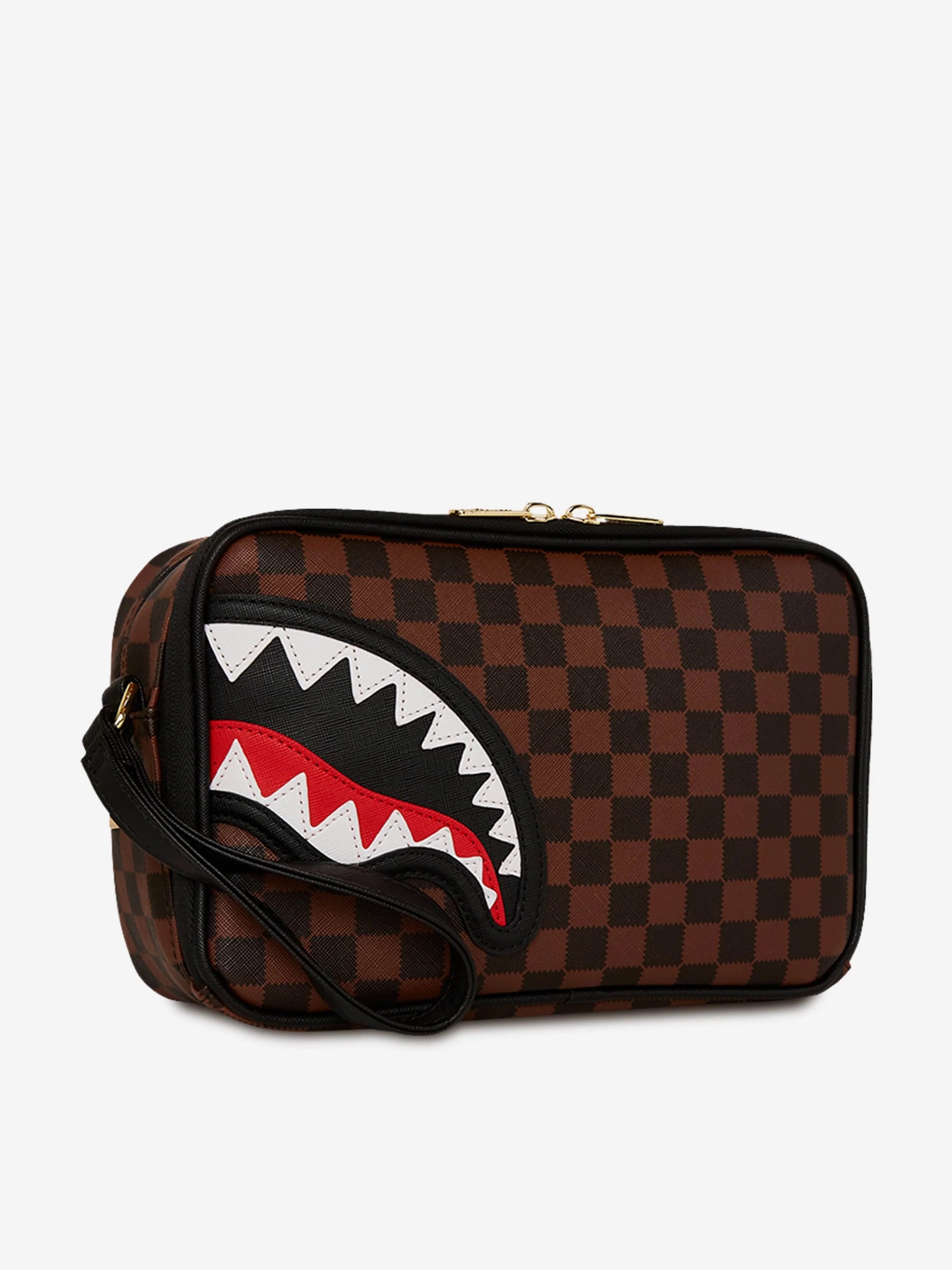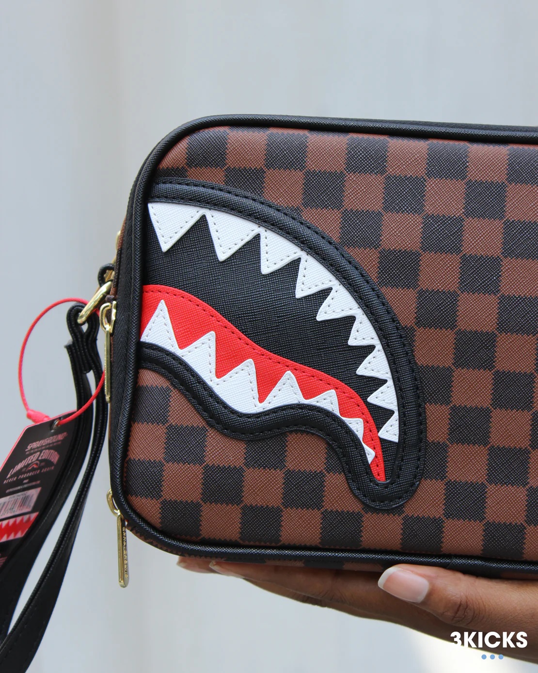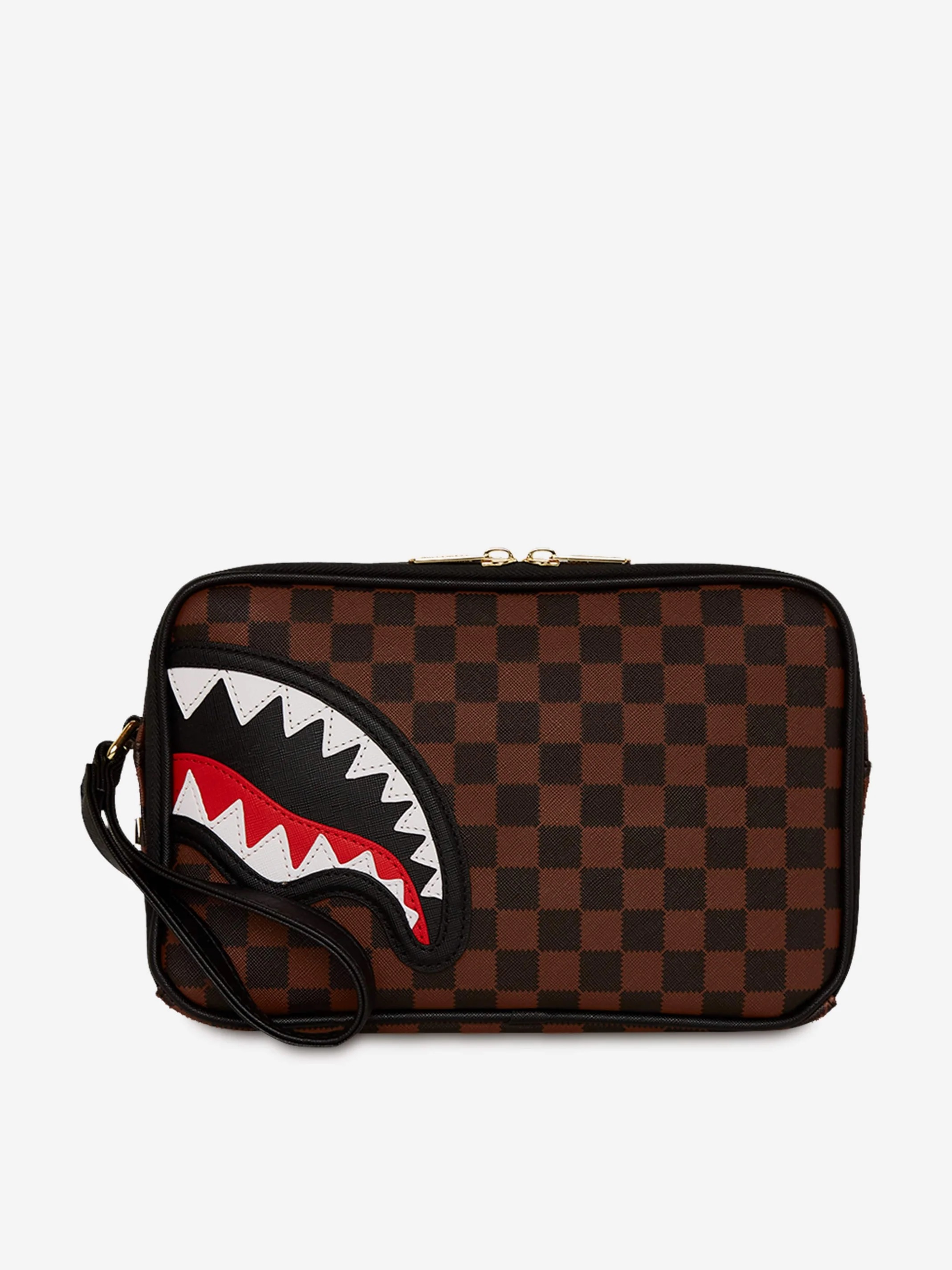 Pochette Sprayground "Sawtooth Sharks in Paris" unisex realizzata in ecopelle marrone con motivo damier e grafica Shark ricamata sul lato. Dotata di due scomparti con chiusura a zip, tasca interna, fodera rossa e dettagli in metallo dorato. Cinturino da polso rimovibile per un trasporto comodo e sicuro.
