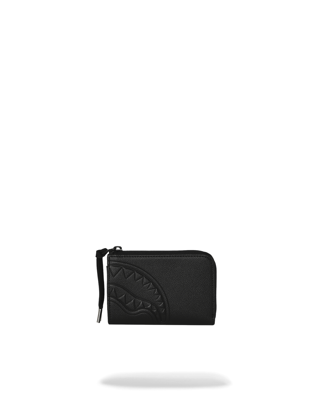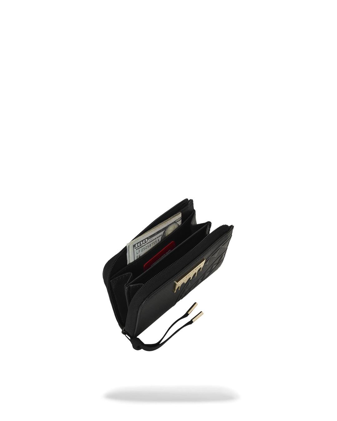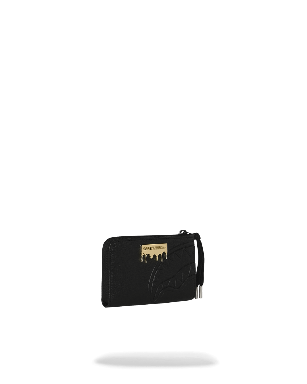 L'iconico motivo a denti di squalo è impresso a rilievo sul lato destro, tono su tono. L'effetto è visibile solo grazie al gioco di ombre sulla pelle. Il punto focale è la placca metallica dorata Sprayground con effetto dripping. Dotato di una zip-around integrale nera e di un cinturino da polso rimovibile con terminali in metallo dorato.