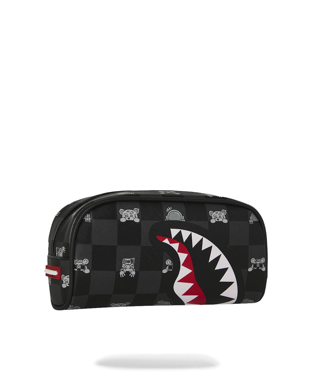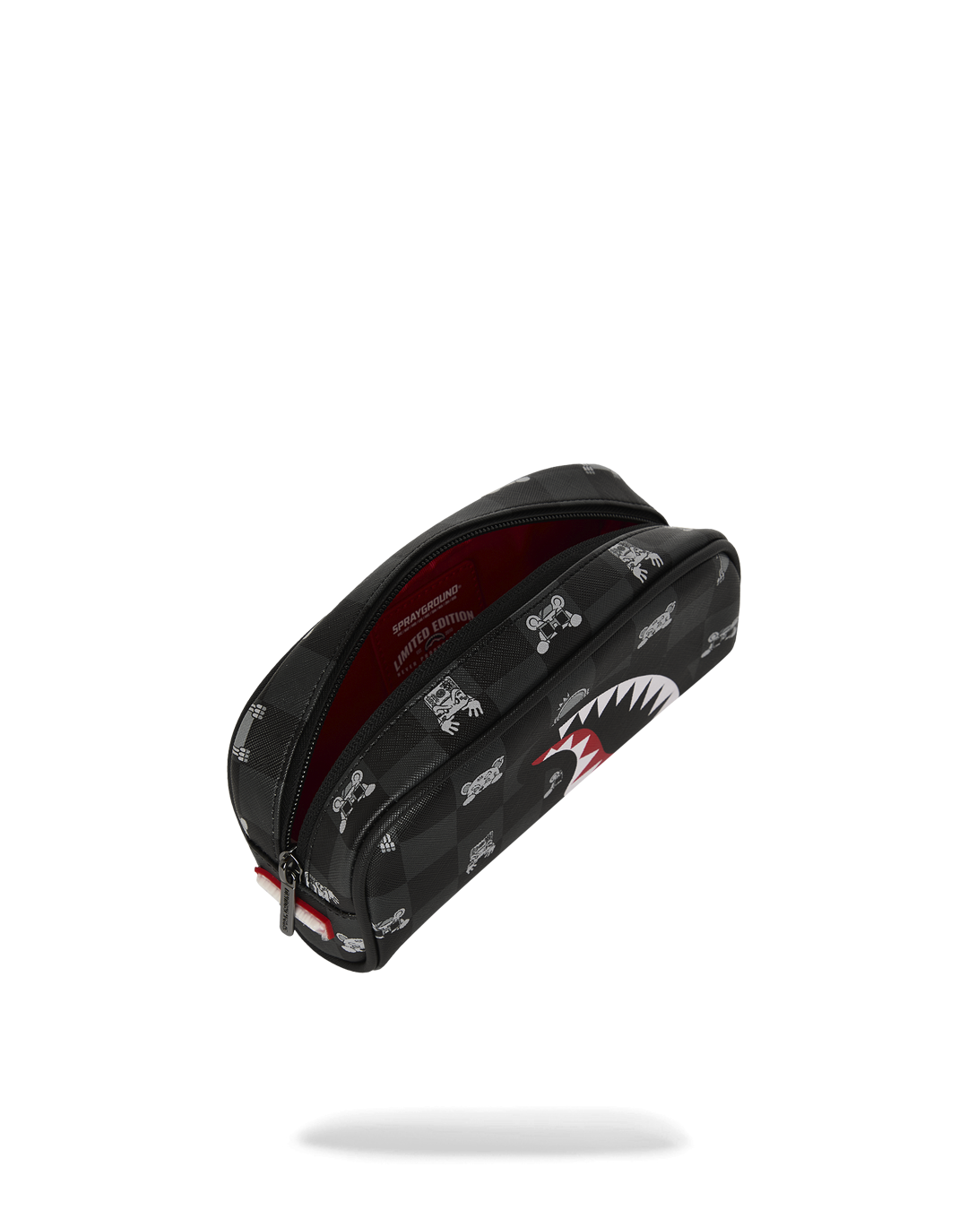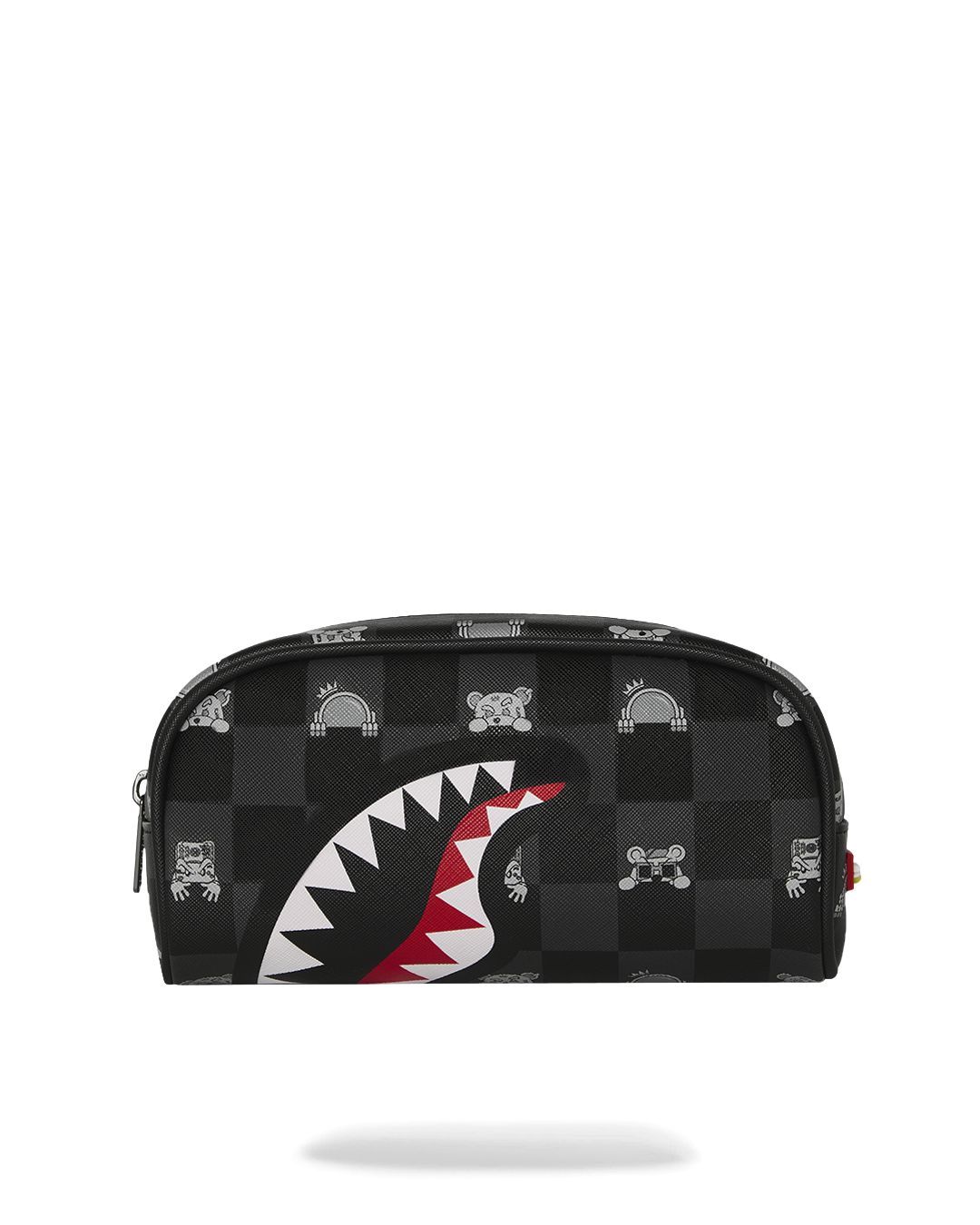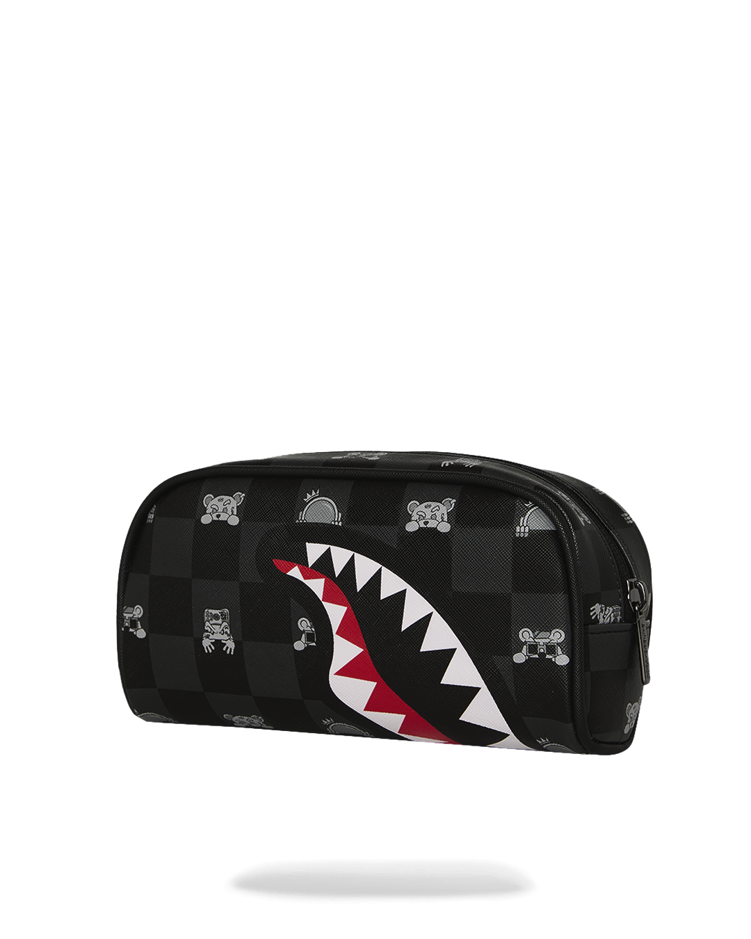 Il portapenne riprende il motivo checkerboard a scacchi nei toni del grigio fumo e grigio scuro. Anche in questo formato ridotto, il cuore del design è la bocca di squalo stampata frontalmente, dalla quale spuntano gli occhi del misterioso personaggio che sbircia. Design rettangolare compatto. Dotato di una cerniera robusta con cursore in metallo personalizzato Sprayground.