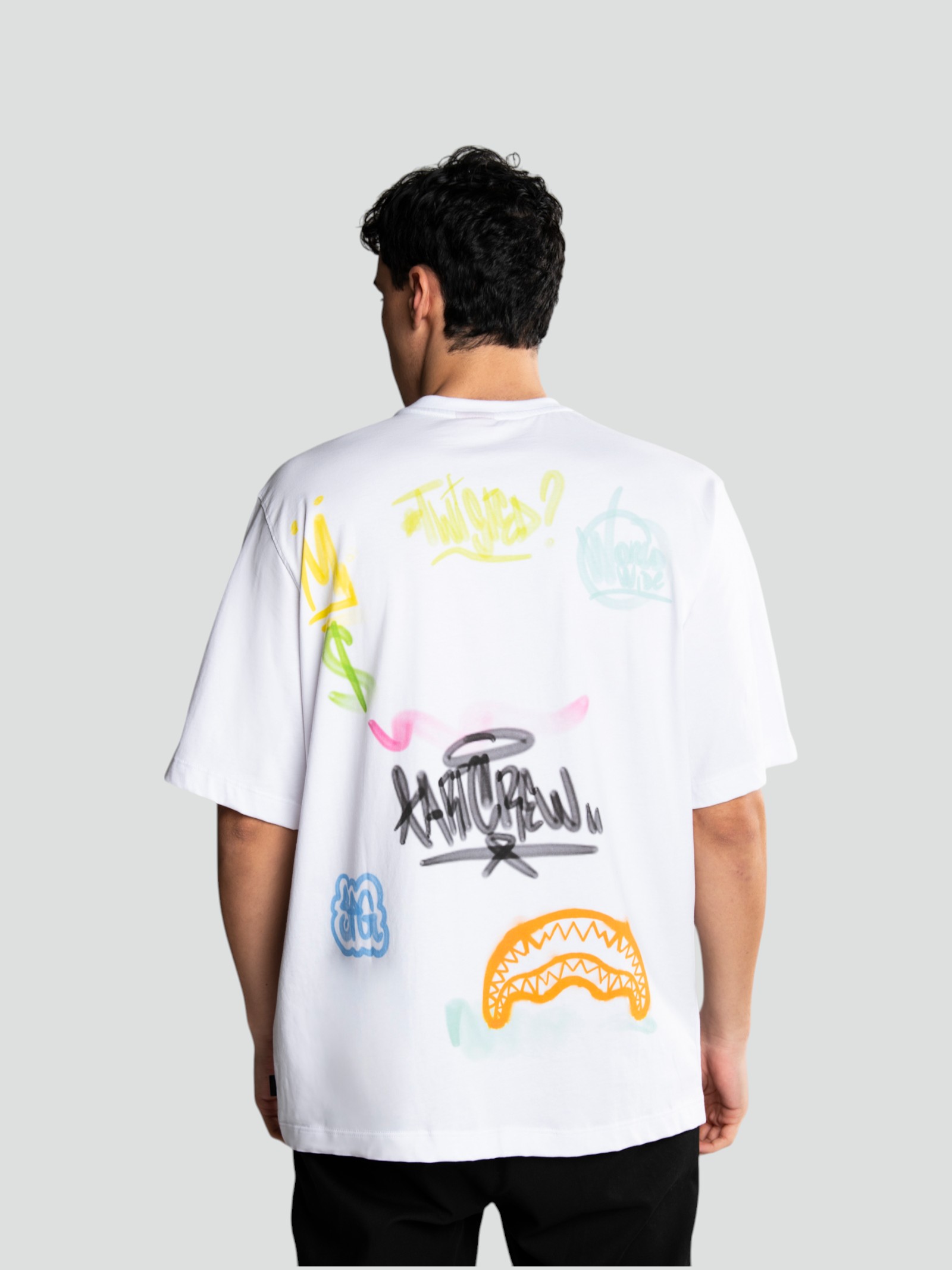 T-shirt da uomo bianca in jersey leggero con stampa digitale effetto bomboletta spray rosa e gialla. Logo Sprayground sul fronte e sul retro. Vestibilità over per un look streetwear creativo e distintivo.