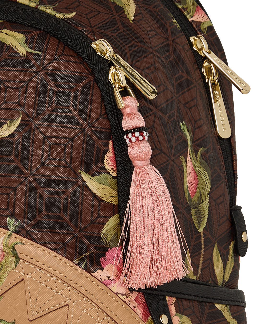La base presenta il classico monogramma Sprayground in tonalità marrone scuro. La cerniera superiore è impreziosita da una nappa rosa cipria e charms dorati. Logo frontale e cursori delle zip in metallo dorato lucido. Ampio scomparto principale. Tasche laterali esterne. Tasca segreta con zip sullo schienale per documenti o smartphone. Tasca interna organizer.