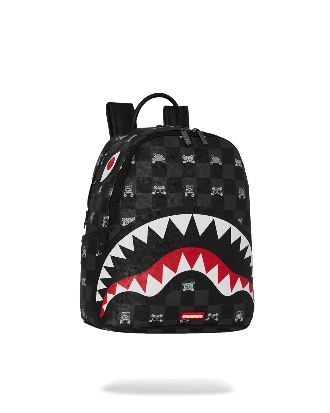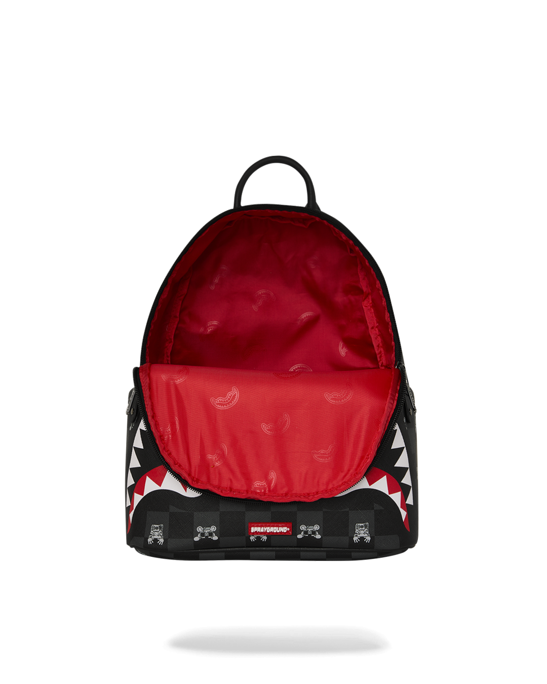 Lo zaino utilizza l'iconico pattern a scacchi Sprayground in una tonalità di grigio fumo e grigio antracite. La bocca di squalo è delineata in rosso vibrante, creando un contrasto netto con la scala di grigi dello sfondo.