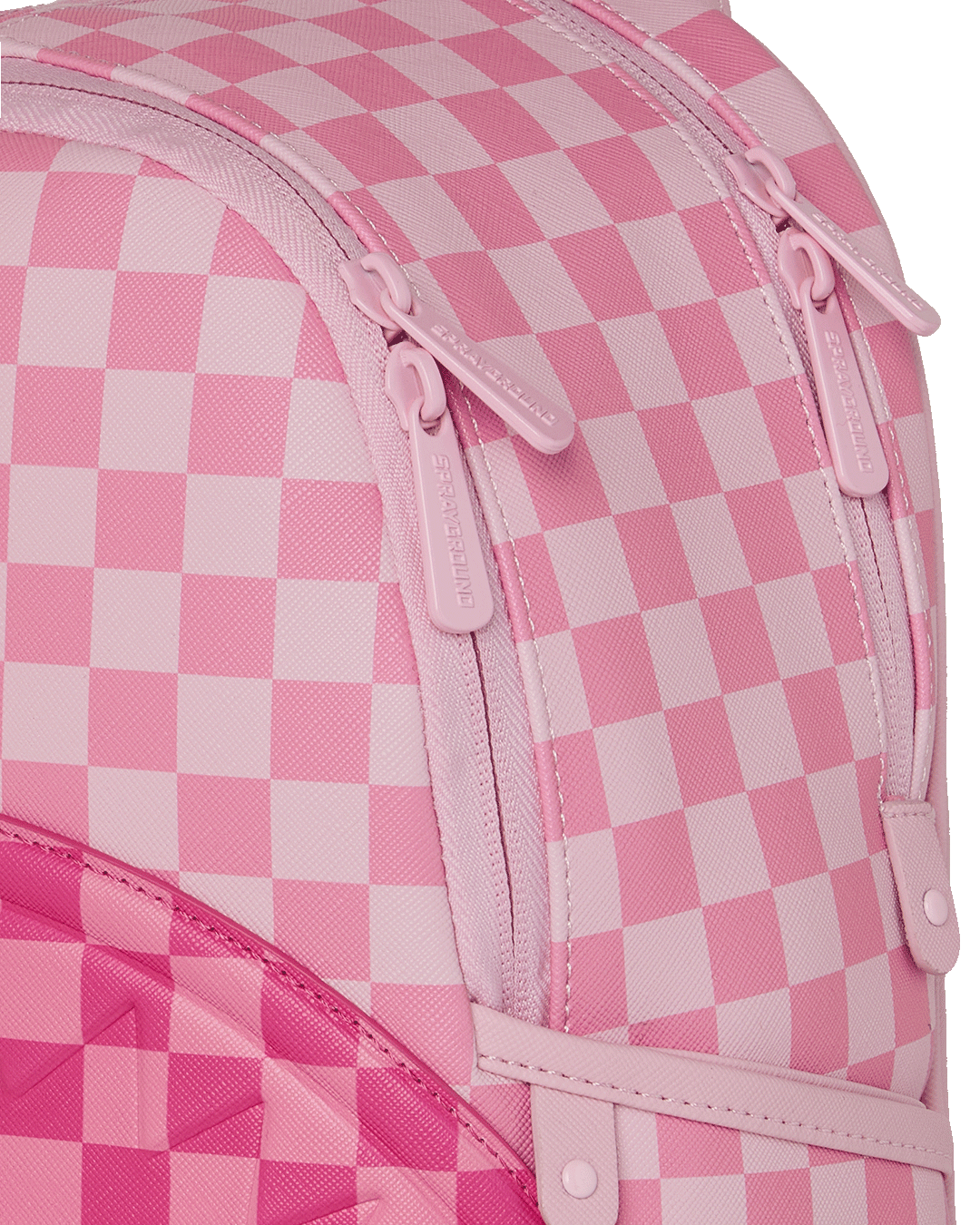 L'intera superficie è rivestita dall'iconico motivo a scacchi Sprayground, giocato su due tonalità di rosa. La celebre bocca di squalo frontale è realizzata con una patch applicata in una tonalità di rosa più scuro e intenso.